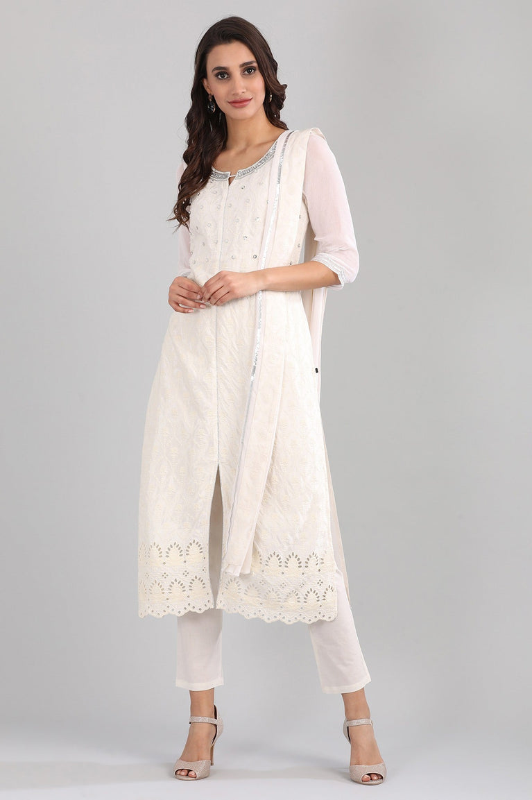 This kurta set has a white round neck kurta with neckline detail, ivory coloured trousers and chiffon dupatta.