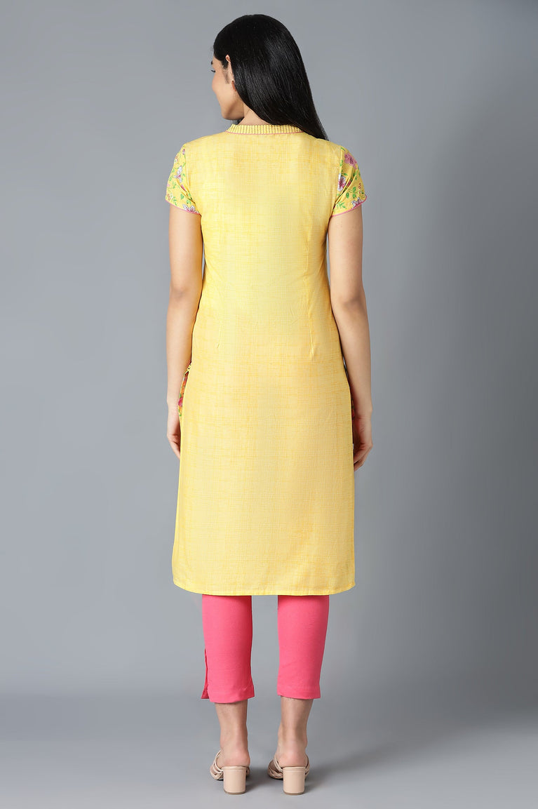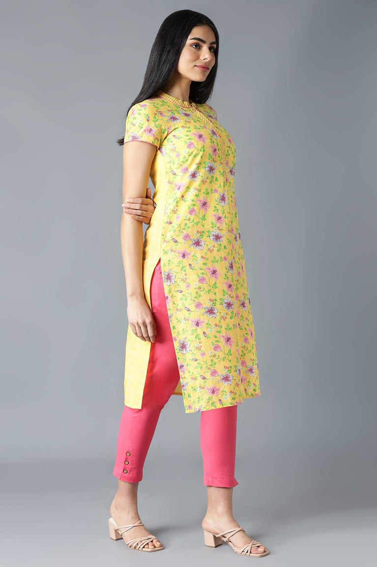 Stay chic and stylish by wearing this yellow straight kurta. Flattering floral motifs and has round neck with button placket and short sleeves.