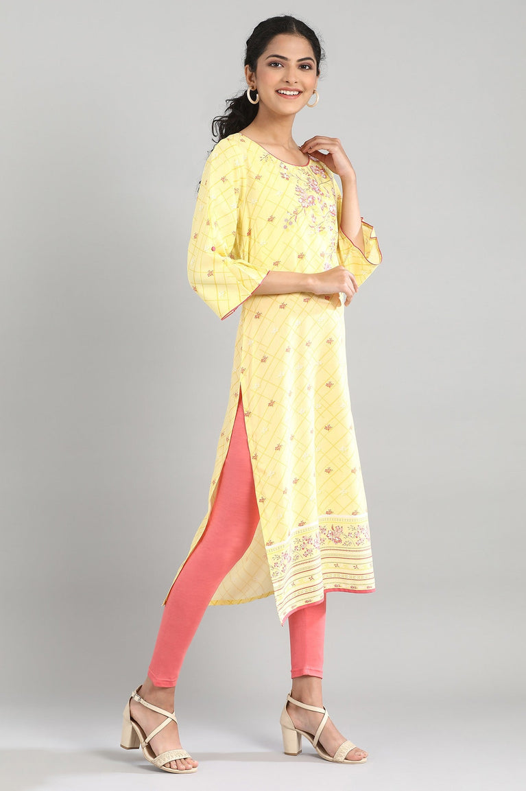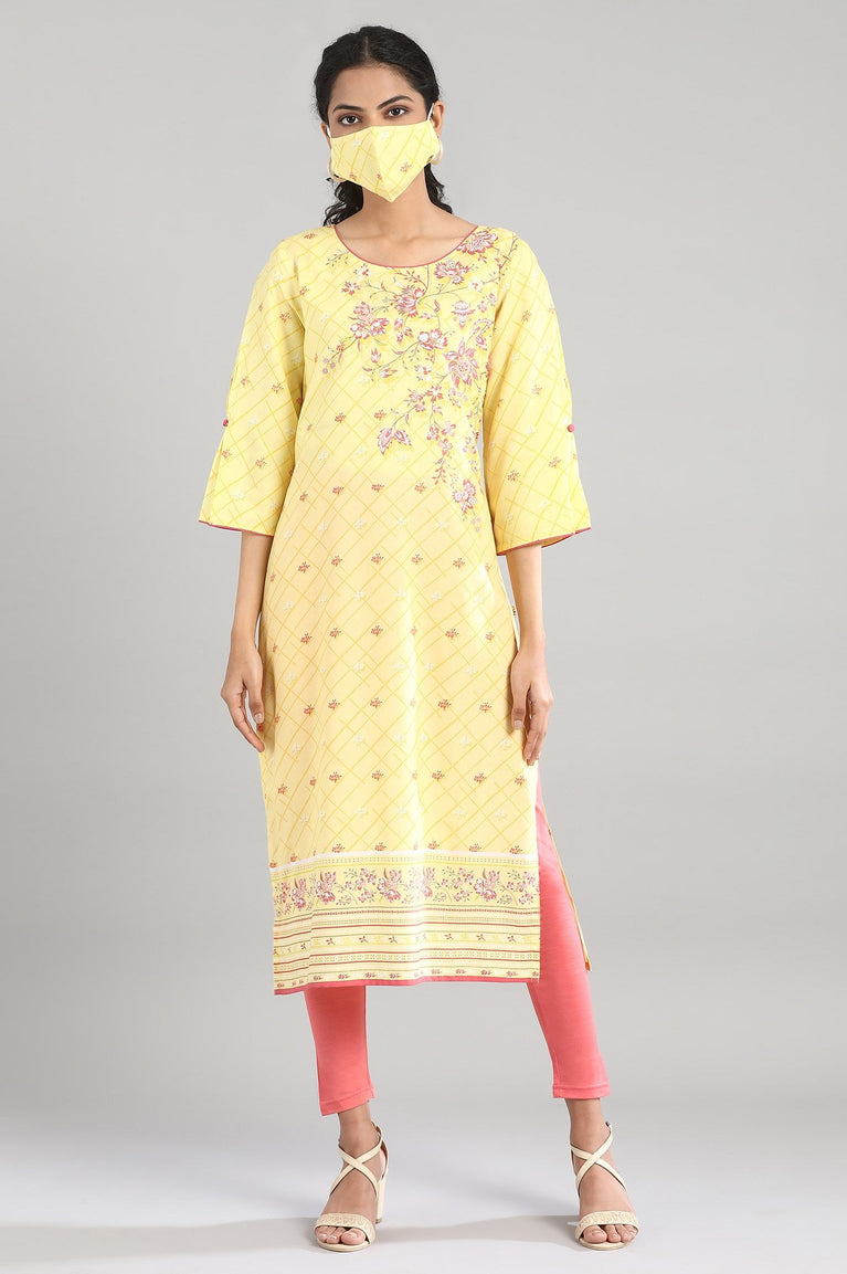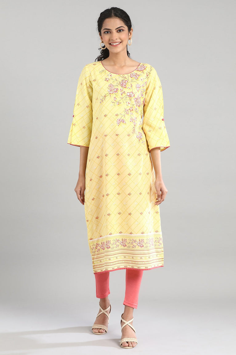 Yellow printed kurta in round neck and three-quarter sleeves.