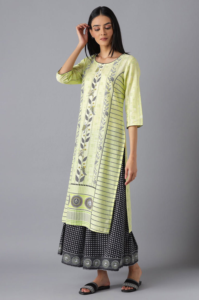 Embrace ethnicity in style by wearing lemon grass coloured kurta. This modern ethnic kurta will uplift your casual look, whether you're on a date or in office it's straight fit will give an elegant yet stylish look.