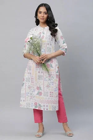 White Floral Printed Straight Pure Cotton Kurta