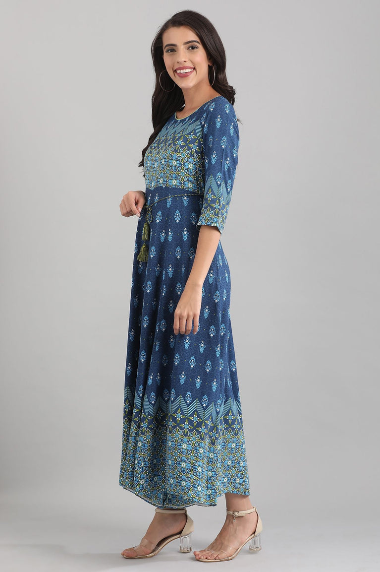 Blue Round Neck Printed Liva Dress
