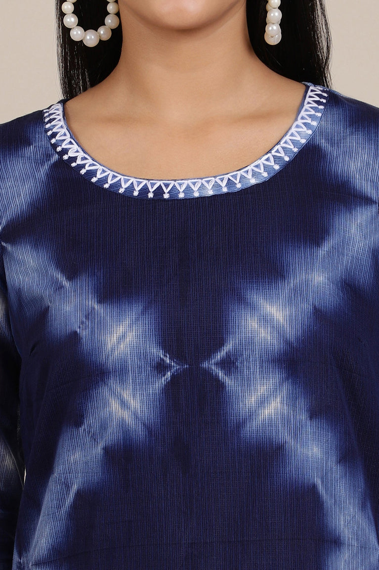 Blue Tie and Dye Kota Straight Kurta with Thread Embroidery