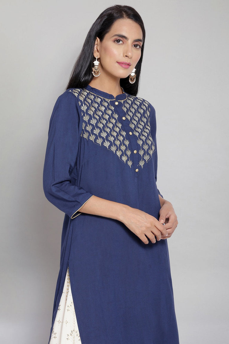 Get the chic and charming look by wearing this dark blue kurta. Crafted in premium fabric, the kurta flatters zari embroidery on yoke and comes in mandarin collar with button closure.