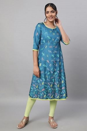 Blue Floral Printed Sequined Ethnic LIVA kurta