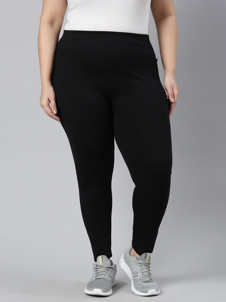 Have fun while sweating out in a pair of comfortable Solid Black yoga Leggings. Made from cotton stretch fabric, it has a high rise elasticised waistband & is of ankle length.