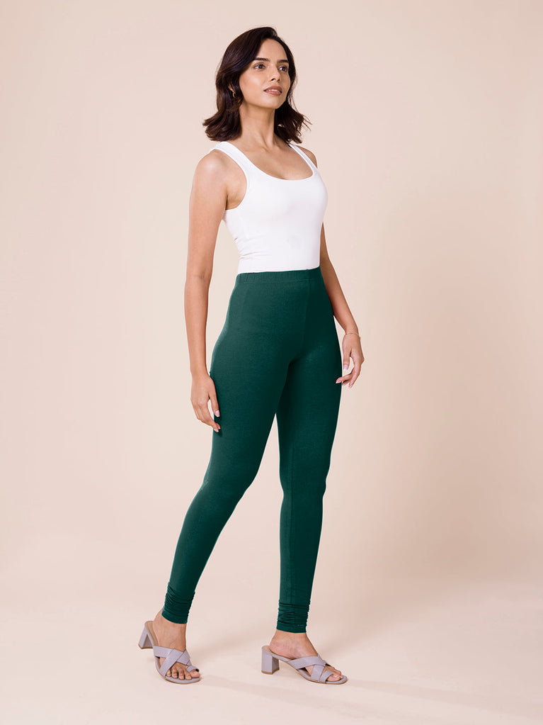 Go chic with a pair of Dark Green Solid Churidar Leggings. Made from high quality cotton, it has a elasticised waistband & gathers at the hemline.