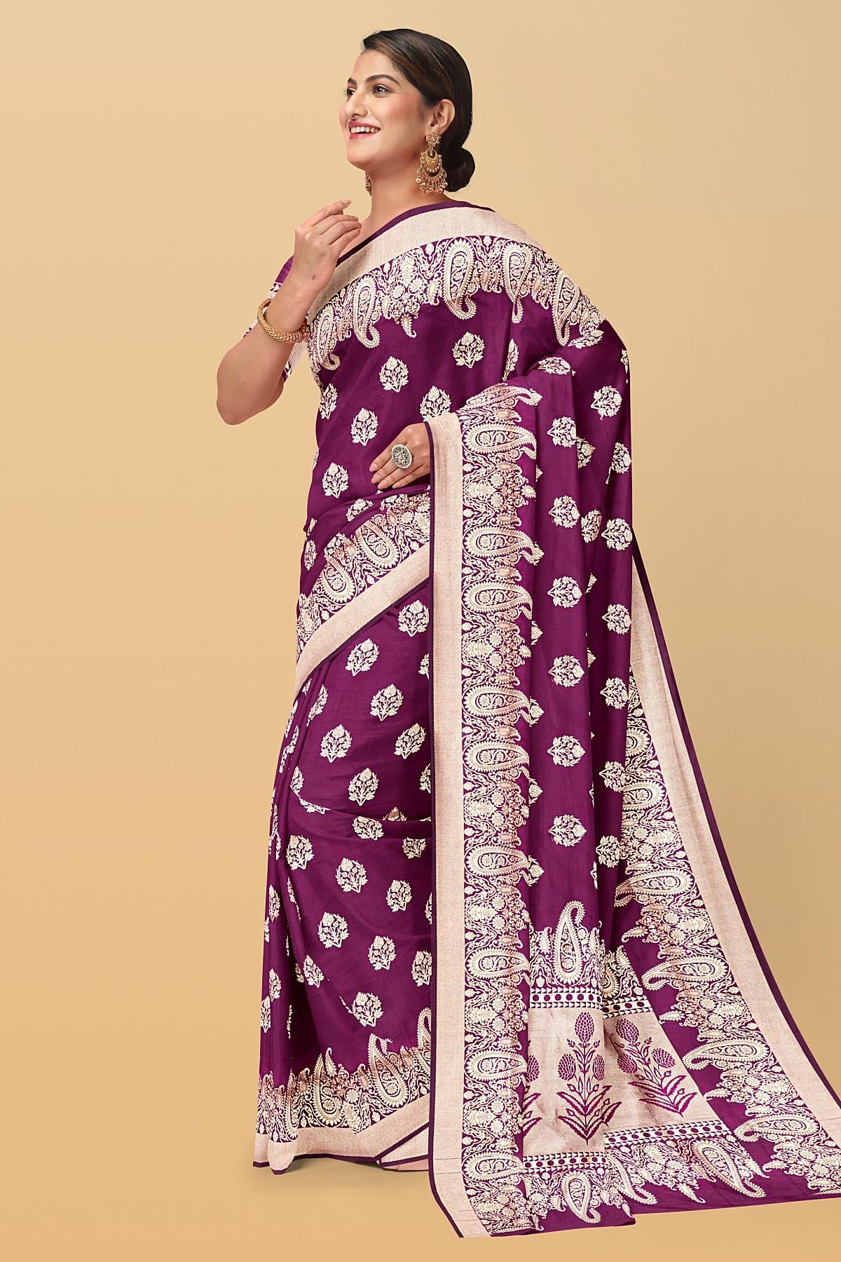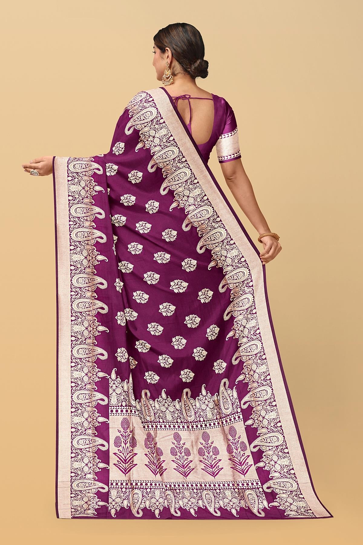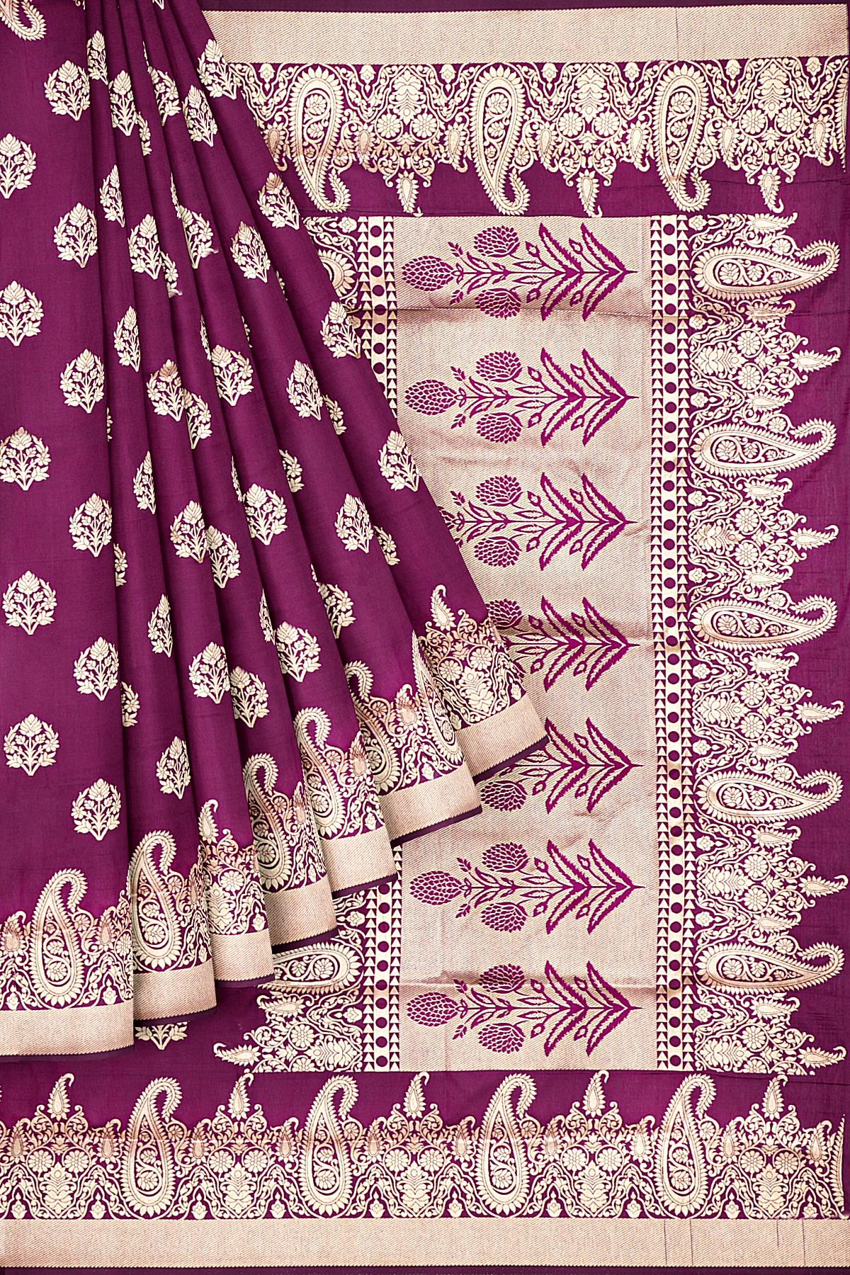 Latest MAGENTA BUTTIS SILK BLEND Saree with SELF ZARI border. This saree comes with PLAIN WITH BORDER SILK BLEND blouse.