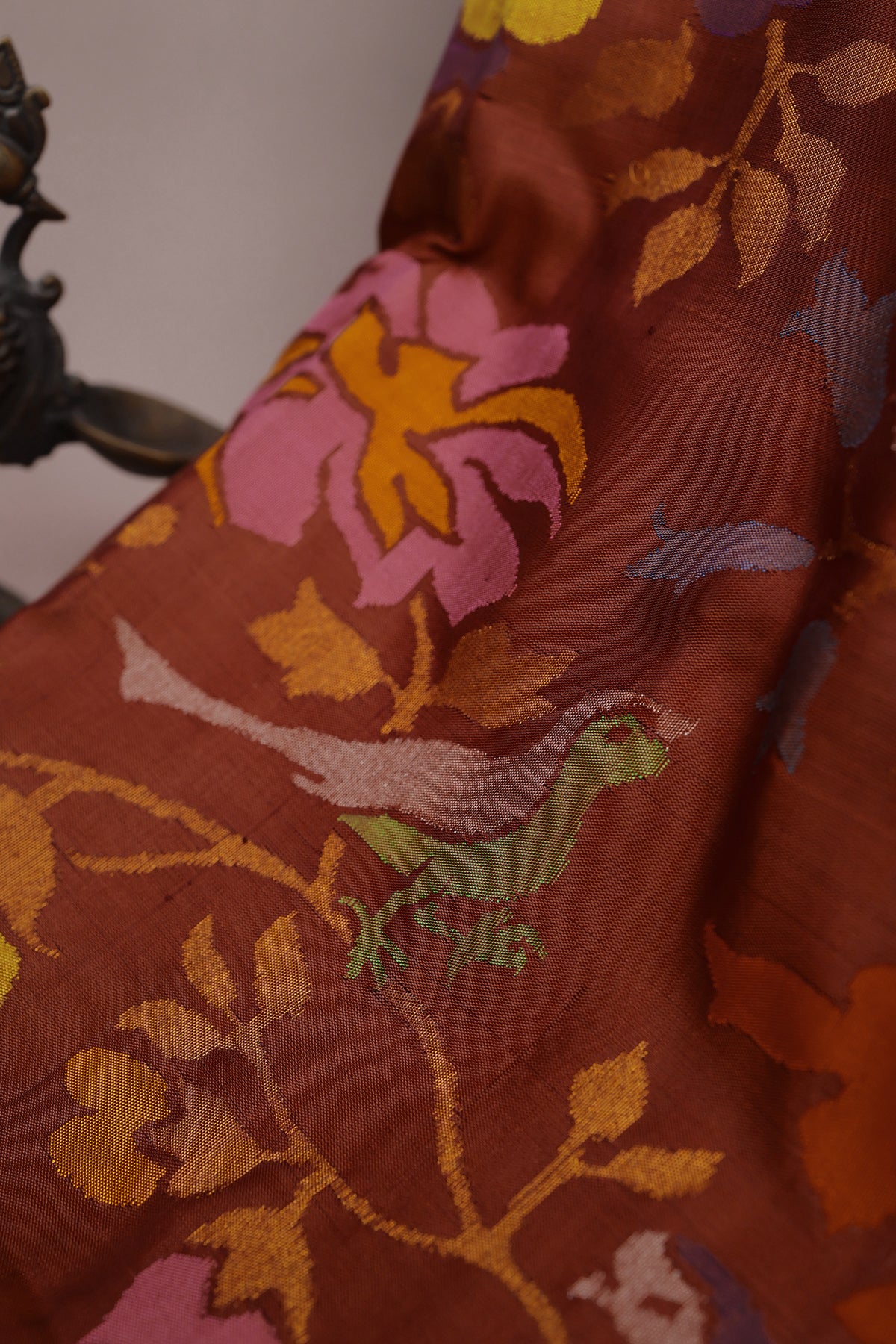Cherish your treasured days with our beautifully crafted Uppada Silk Rust Saree, ornamented with Florals and Leaves Jaal With Birds across it's body, which is ringed by a Kaddi Self border. A brocade pallu and a self-border blouse complement the overall elegance of the saree.