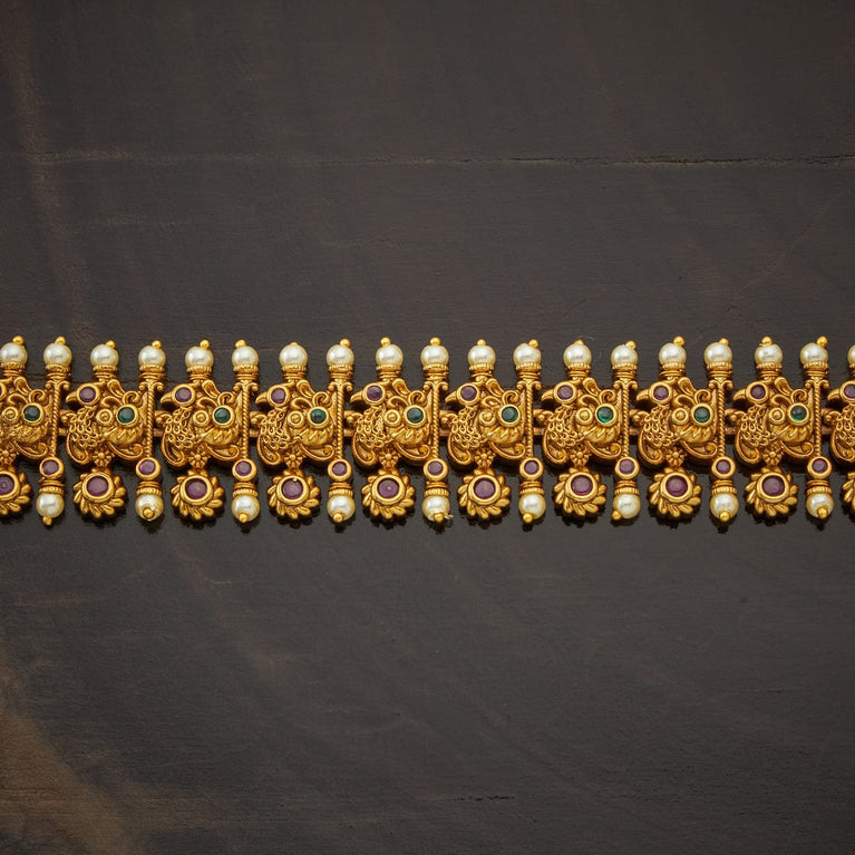 Kushal's Fashion Jewellery Leaf Pattern Antique BeltAccentuate your traditional outfit with the Antique Belt. Intricately designed from a copper alloy and embellished with synthetic stones, it’s a blend of elegance and craftsmanship. The gold polish highlights its rich design. At 70 cm, it gracefully encircles the waist, and its adjustable chain ensures it complements every silhouette perfectly.