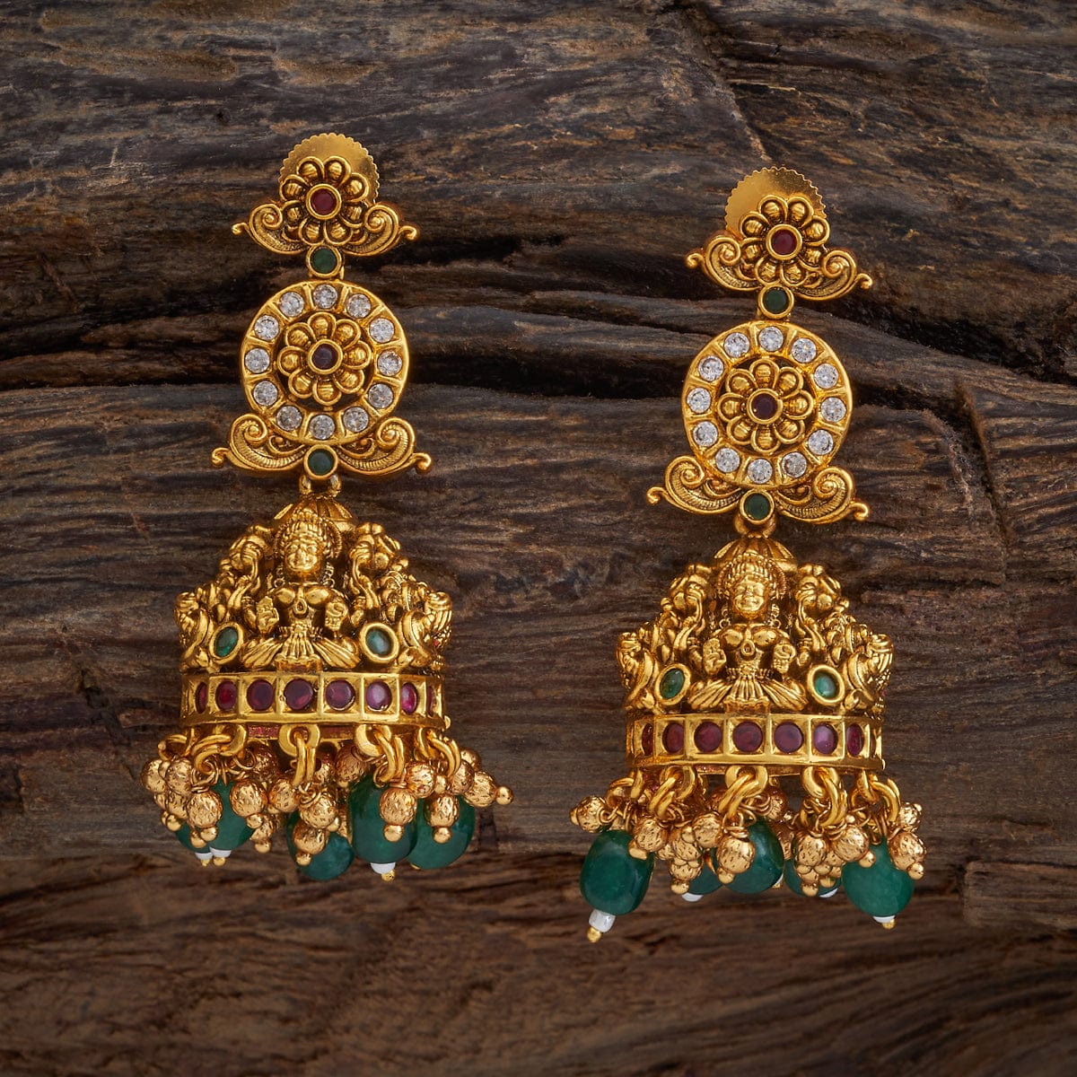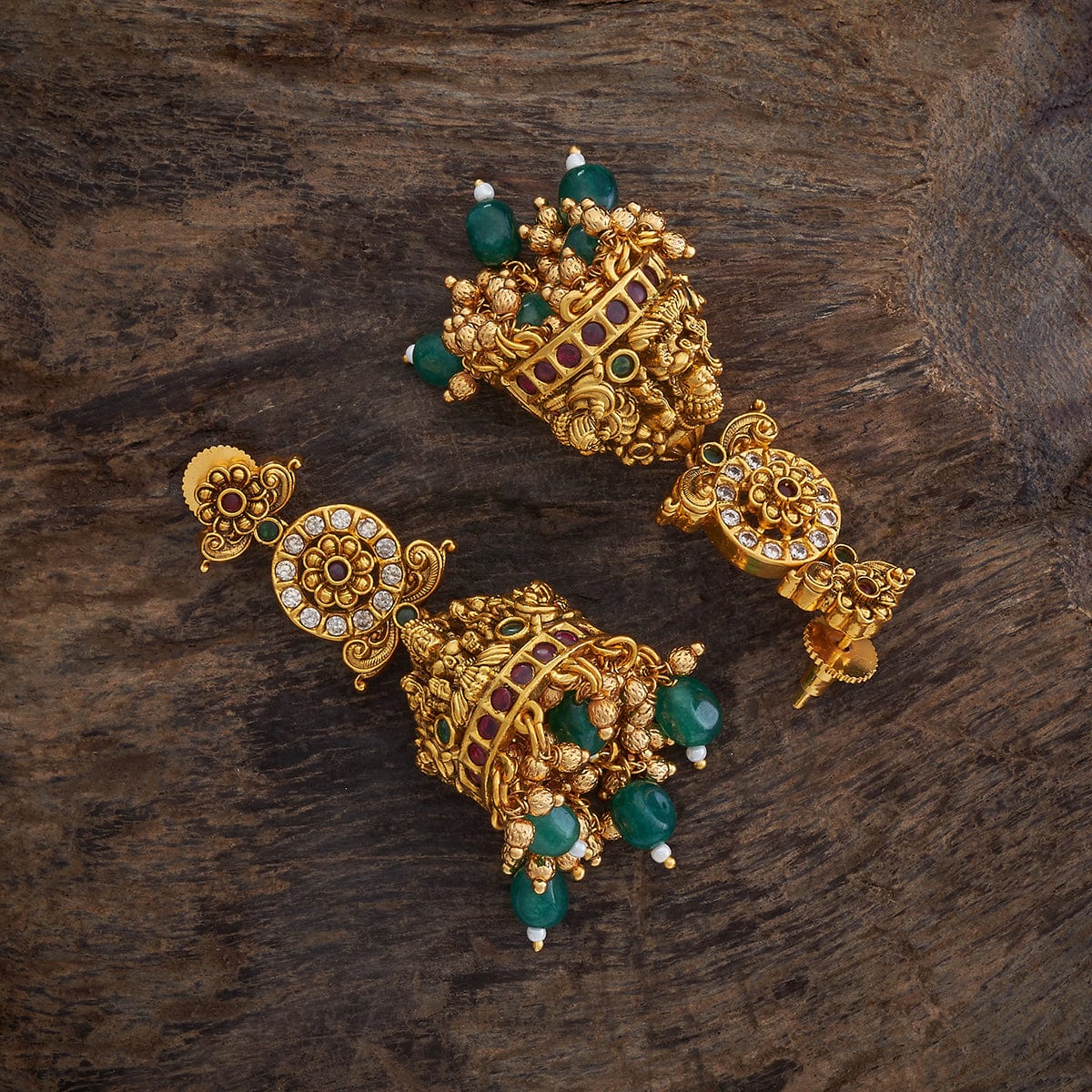 Elevate your traditional look with these antique earrings, featuring a blend of ruby-green synthetic stones, shimmering zircons, and a radiant gold polish. Perfect to pair with a silk saree, these earrings add a touch of elegance and charm, making them ideal for festive occasions and cultural celebrations.