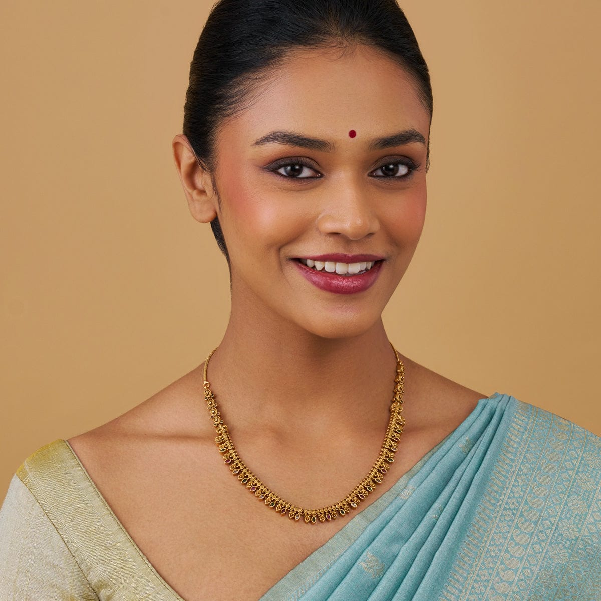 Bring a classic charm to your look with this exquisite antique necklace from Kushal's Fashion Jewellery. Crafted from copper alloy with a gold polish, it features synthetic stones in three colour options for added elegance. The adjustable chain ensures a perfect fit, while the short necklace style offers a timeless look that pairs effortlessly with any outfit.