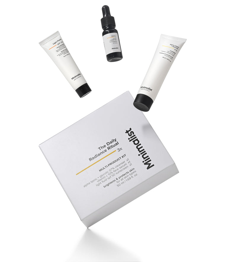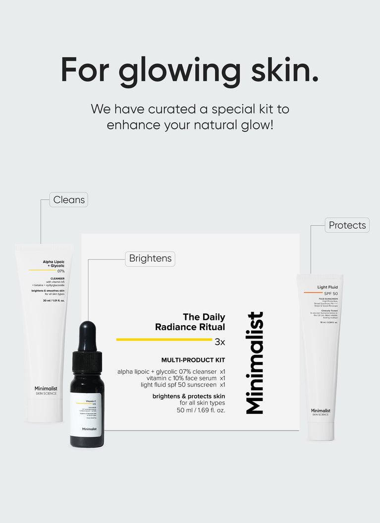 Introducing the Radiance Kit—your ultimate glow-boosting trio for healthy, radiant skin. This kit includes the Alpha Lipoic+Glycolic Cleanser, an everyday brightening cleanser with ALA to enhance skin tone and Glycolic Acid to exfoliate for a fresh, youthful look. Follow up with the Vitamin C Serum, packed with Vitamin C and Polyhydroxy Acid (PHA) to brighten sun-damaged, dull skin and fade dark spots. Complete your routine with the Light Fluid SPF 50, a lightweight, water-resistant sunscreen with advanced UV filters like Tinosorb M and Uvinul A Plus, offering broad-spectrum protection without a white cast. Glow, protect, and renew with every step!