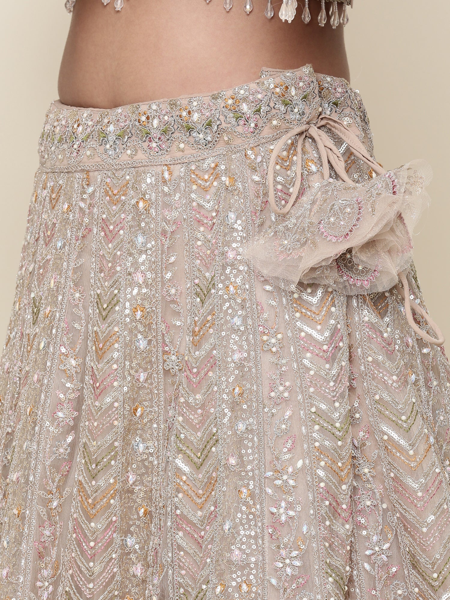 This beige net three-piece ghagra set features heavy embroidery that exemplifies expert craftsmanship and attention to detail. The net fabric provides a delicate, sheer base that complements the elaborate embroidery work, creating a sophisticated and elegant appearance. Designed for comfort and style, the set includes a matching blouse and dupatta, making it ideal for weddings and special celebrations.