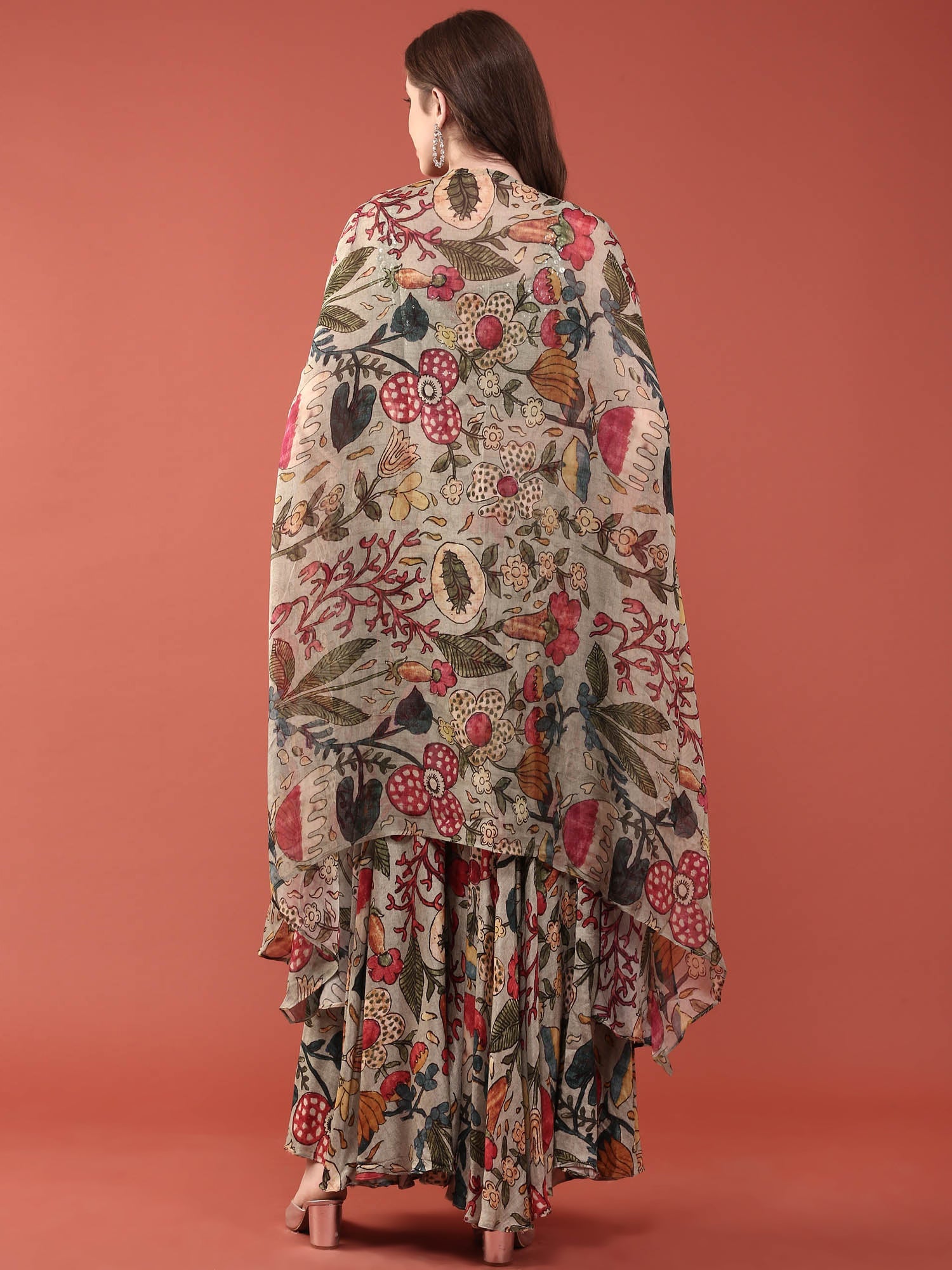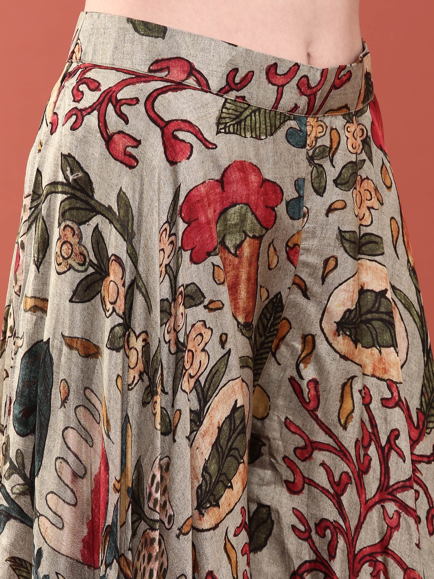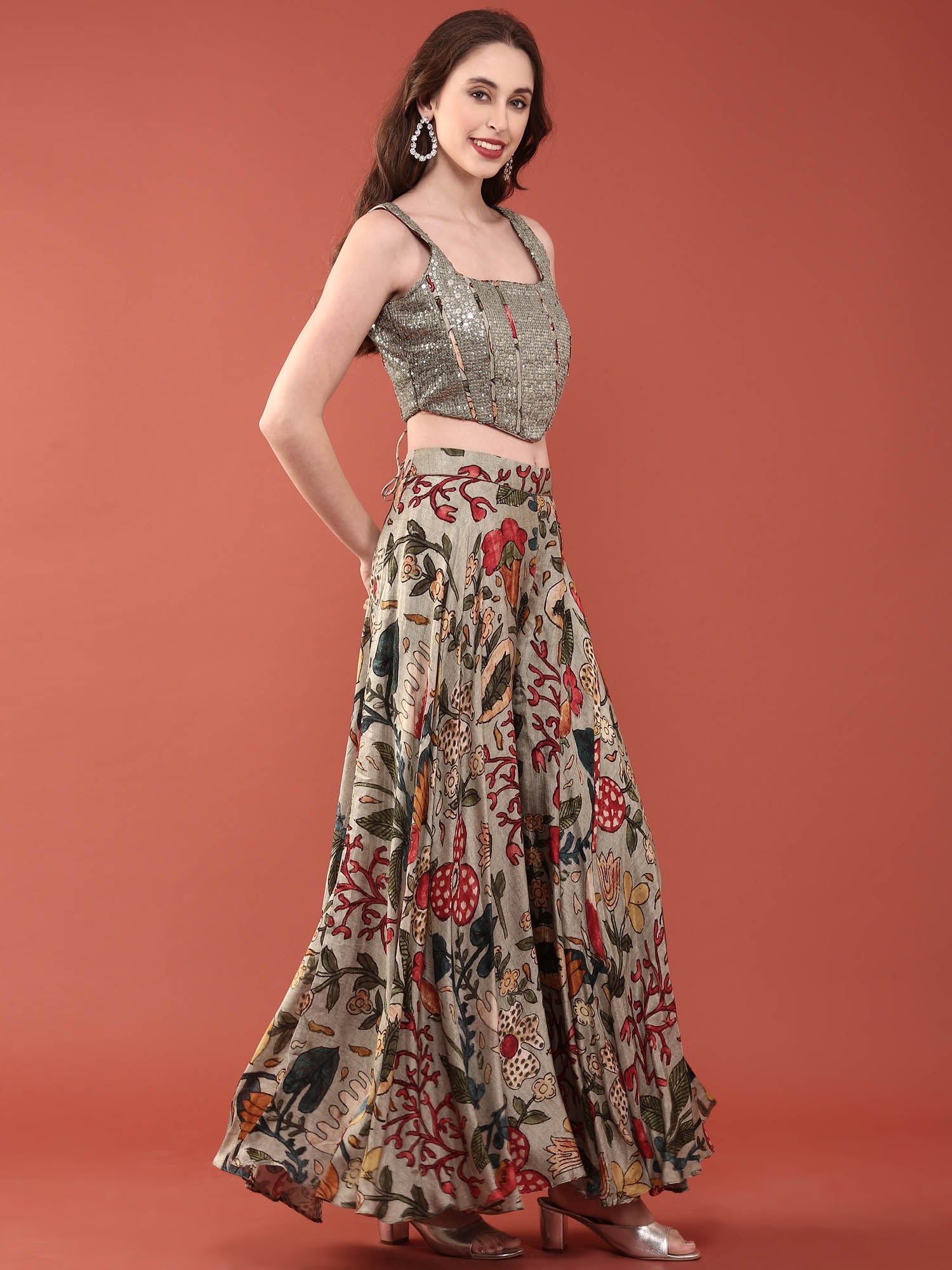 Elevate your ethnic wardrobe with this stunning green silk ensemble that beautifully combines traditional craftsmanship with contemporary style. The crop top features intricate sequin embroidery that catches light with every movement, creating an eye-catching shimmer perfect for celebrations and special occasions. Paired with flowing palazzo pants, this set offers the ideal balance of elegance and comfort.