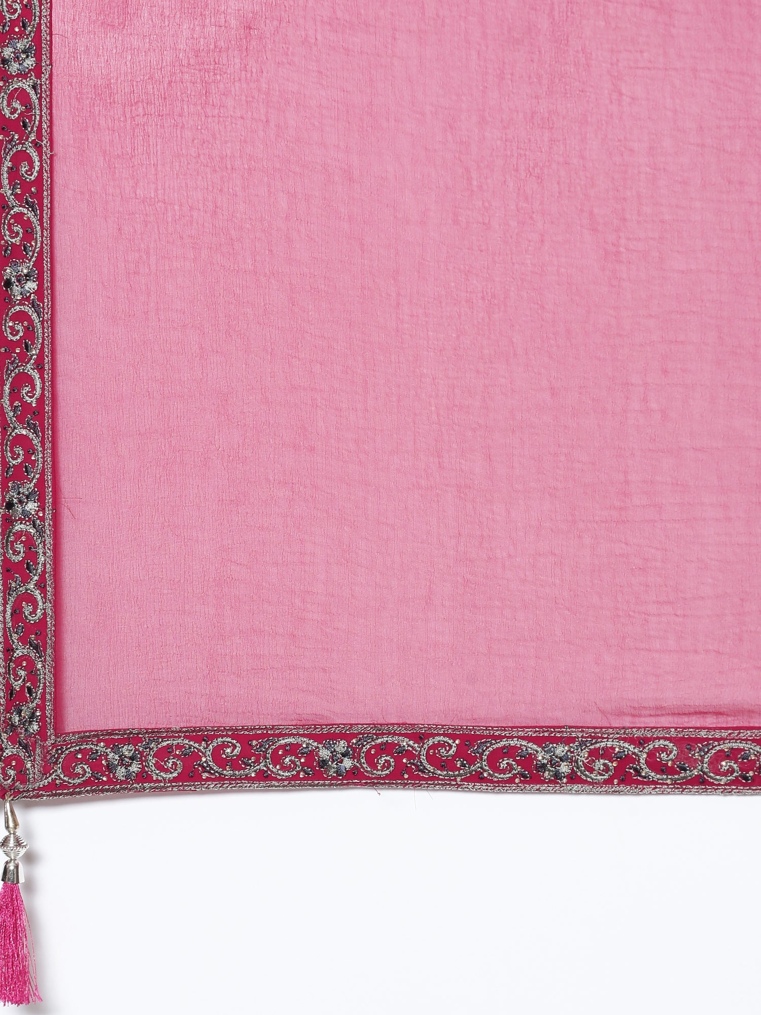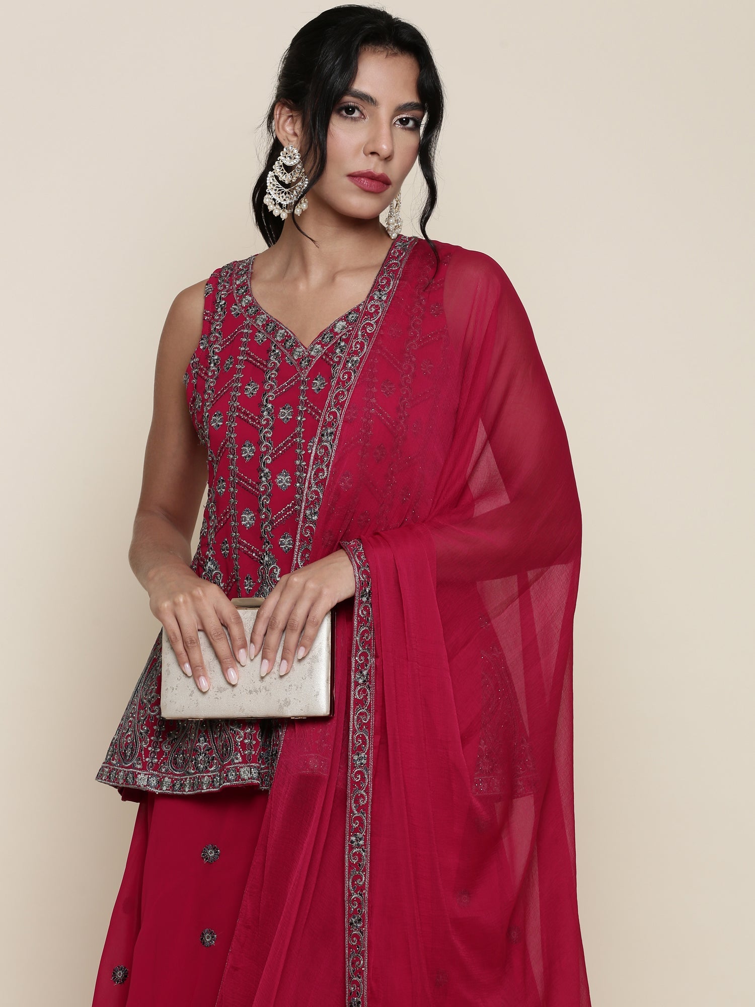 This elegant three-piece set in magenta georgette combines a beautifully embroidered peplum with matching palazzo pants and a complementary piece, creating a cohesive and stylish outfit. The soft, flowing fabric offers comfortable wear and graceful movement, while the detailed embroidery enhances the garment's luxurious appeal. Ideal for special occasions, this ensemble balances traditional design elements with a modern silhouette for a sophisticated look.
