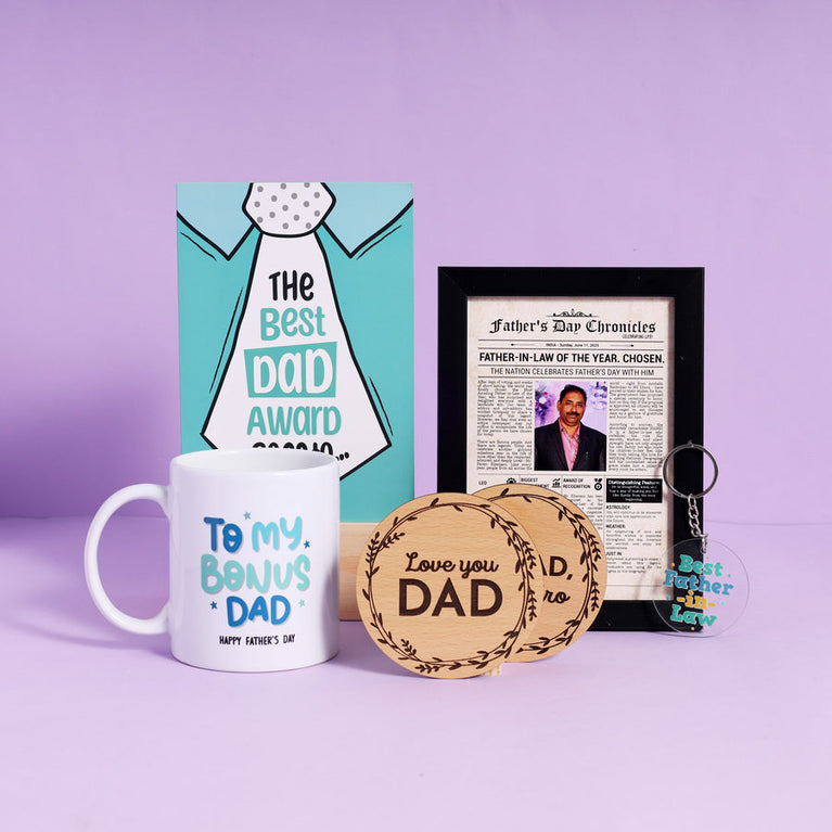 Your father-in-law opened his heart and home to you. Now it’s your turn to say thank you. Here is a sweet way to celebrate your father-in-law. This adorable hamper is filled with gratitude and love for the man who’s been your support system in your new home. The hamper includes:Father-in-law Chronicles - Make your father-in-law a celebrity with a personalized newspaper cover story celebrating his amazing qualities, interests, and nature. This fully customized gift includes a heartfelt message from you, a humorous weather report, an award section, and more. Mirror Card - Here’s a magical greeting card for your amazing father-in-law! This special greeting card is designed with a mirror attached so that when your father-in-law opens the card, he will see his face reflecting on it.Father-in-law Mug - Father-in-laws are the bonus fathers given to us. It's important to tell them how special they are. Here's a cute mug to express your gratitude and make your father-in-law smile everyday!Best Father-in-law Keychain - He may not have raised you, but he has always been there for you. This keychain is an adorable way to remind your father-in-law that he is just the best!Coasters for Dad - For the man who makes you feel like home, these cute coasters are a thoughtful little gift to a truly wonderful father-in-law.Specifications -Size of the Hamper Box : 25 x 10.5 x 19.5 cm Size of the Mirror Card : 12.5 x 17.7 cmsCapacity of the Mug : 330mlSize of the Chronicle Frame : 18.7 x 13.7 cmsSize of the Keychain : 5 x 5 cmsSize of the Coasters : 10.1 x 10.1 cms