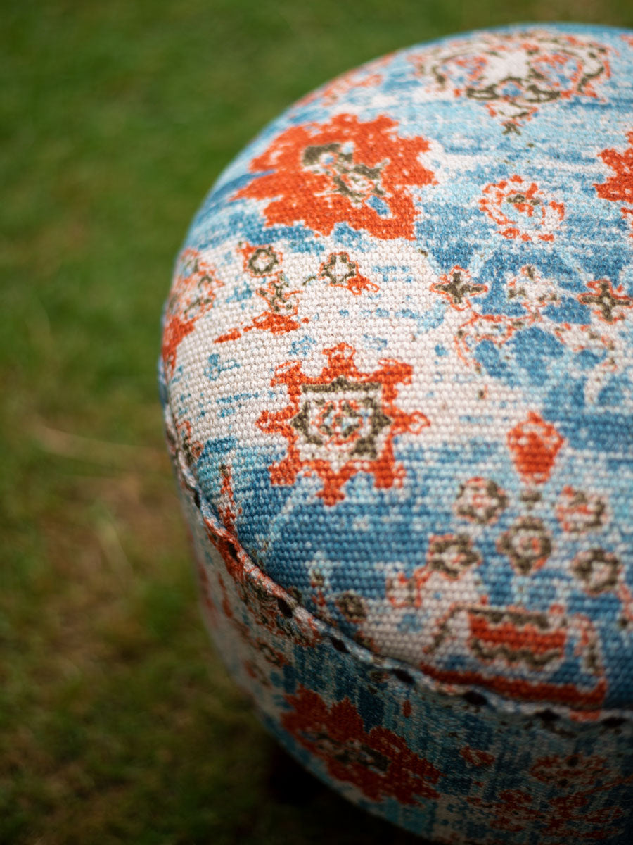 A beautiful combination of utility and design, our ottomans will find a fit in any space. Break the monotony of pastels and wood with a pop of color, and while at it, don't forget to marvel at the finesse and handcraft of each piece. Featuring solid wood legs and handloom rug upholstery.