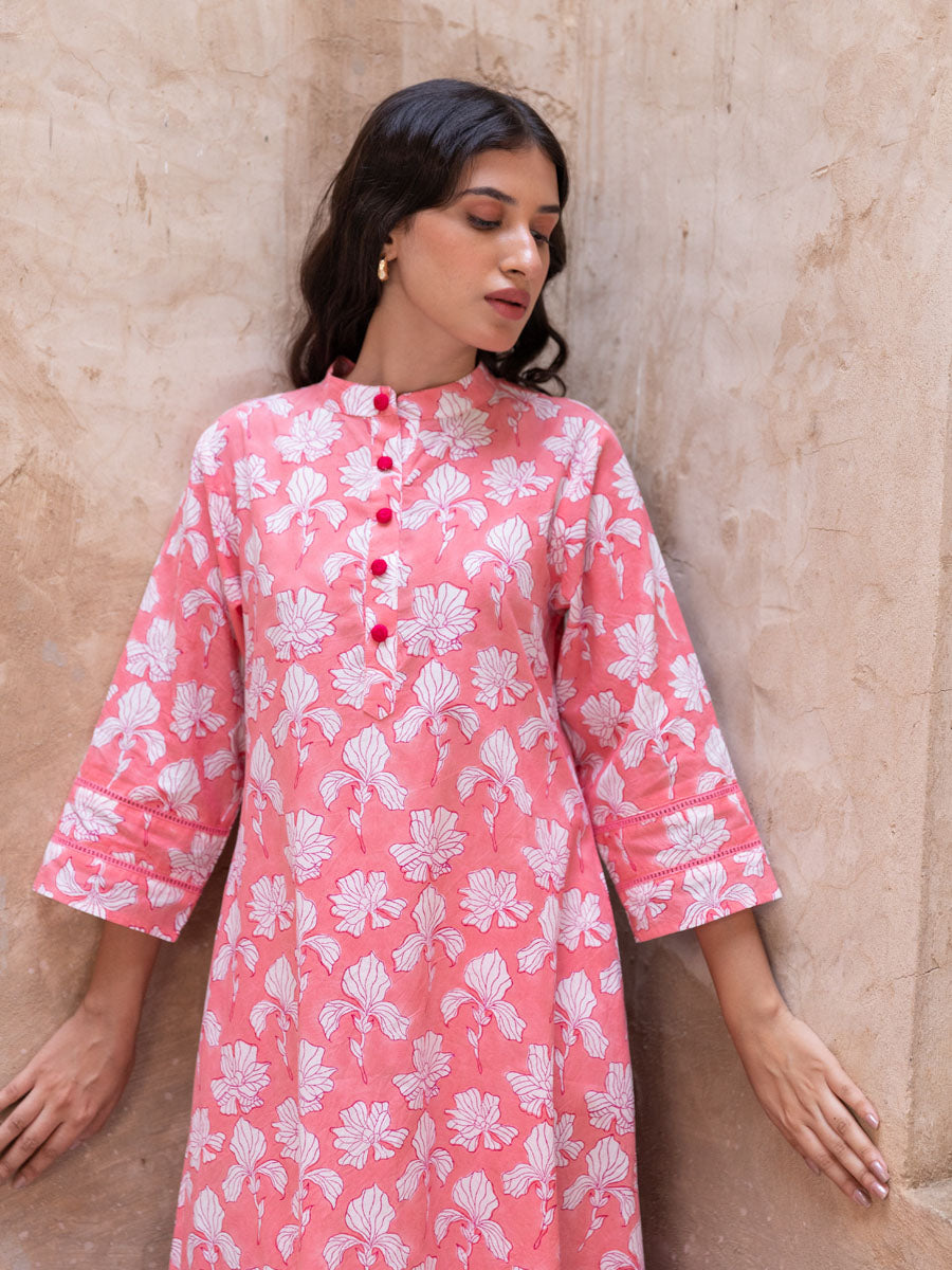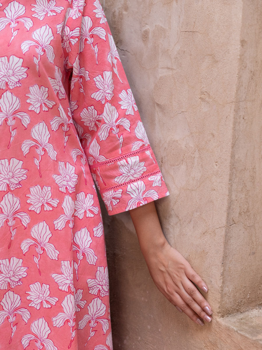 • A-line cotton kurta with pockets, embroidered buttons and ladder lace