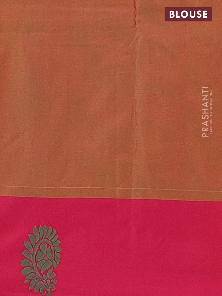Arani semi silk saree green and magenta pink with allover copper zari weaves and zari checked border