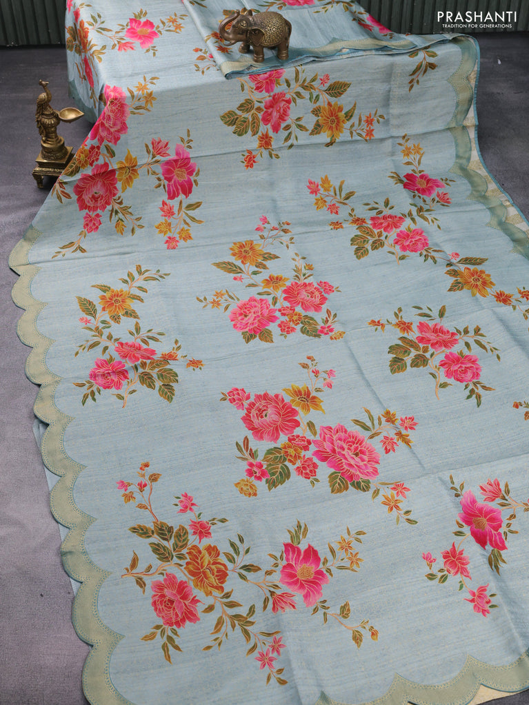 Banarasi silk saree pastel blue with allover floral prints and scallop design border