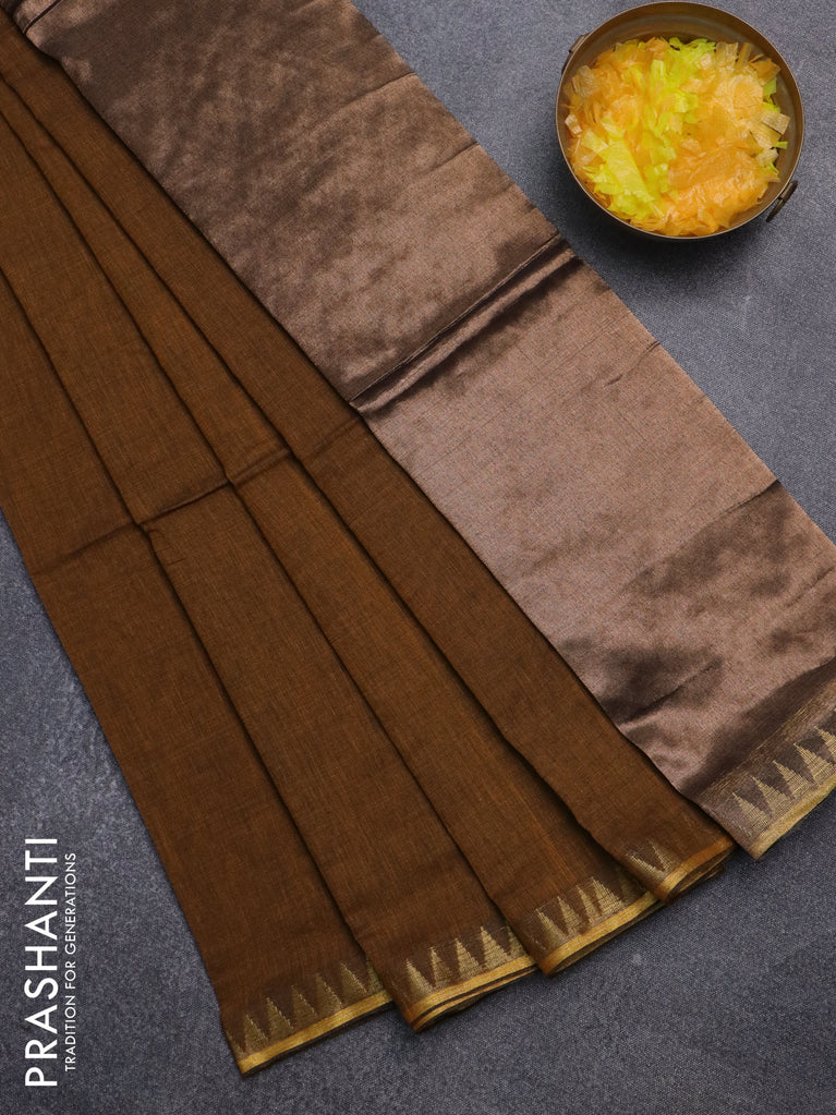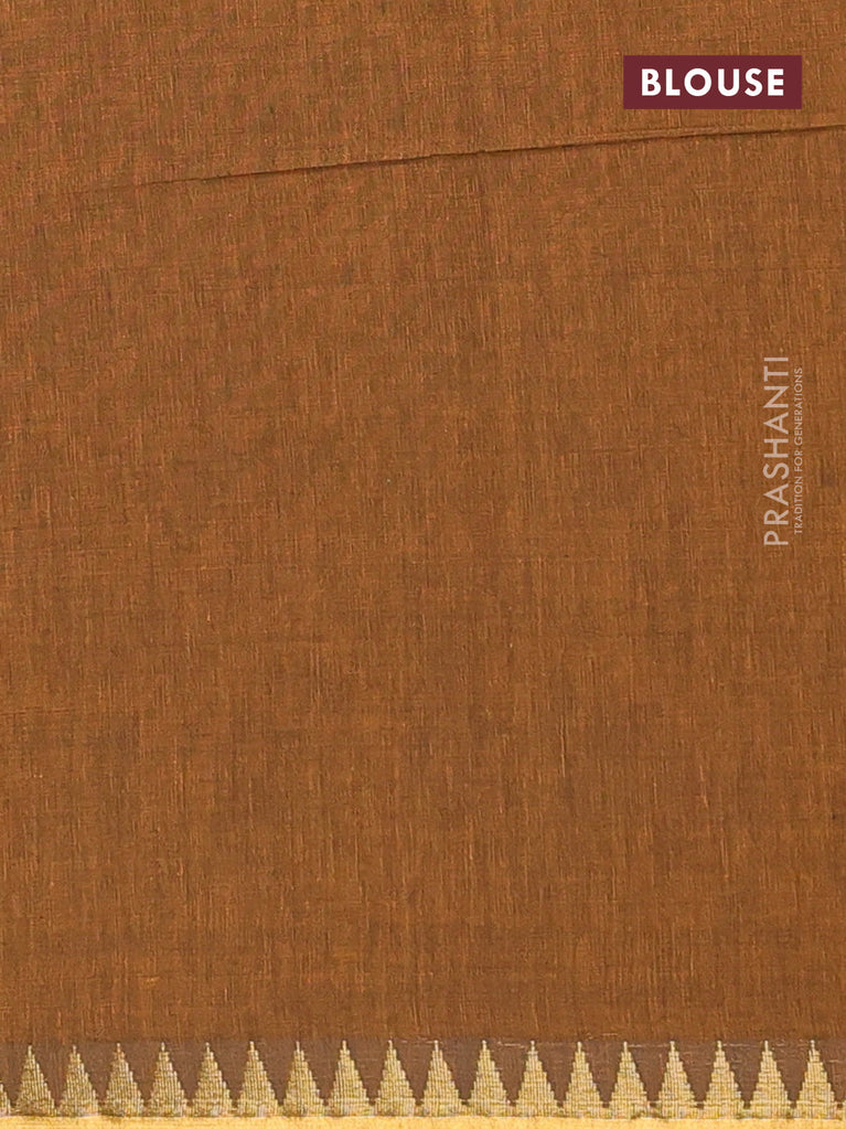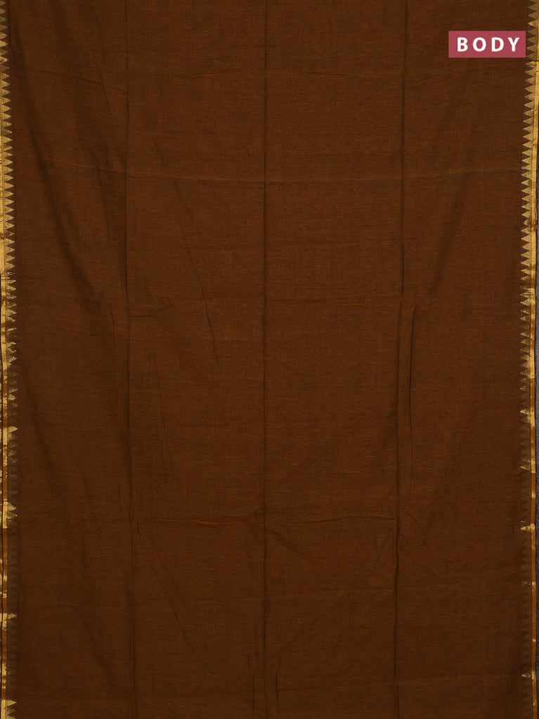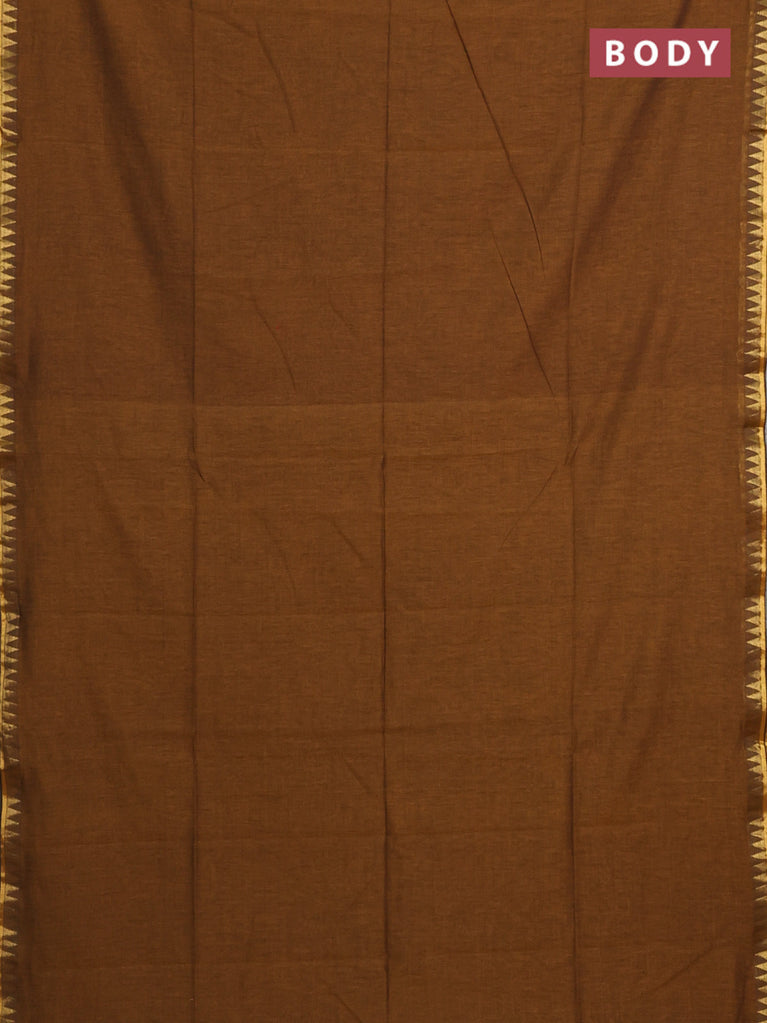 Bengal soft cotton saree dark msutard with plain body and temple design zari woven border