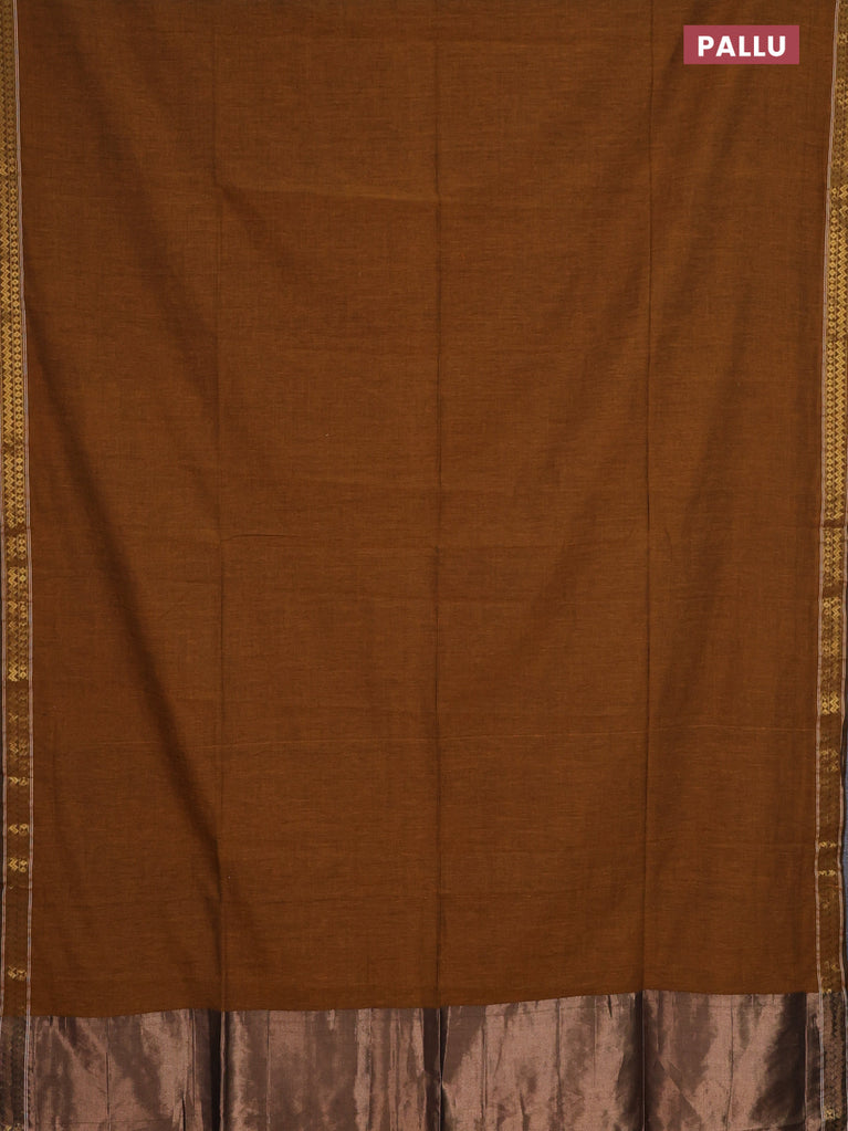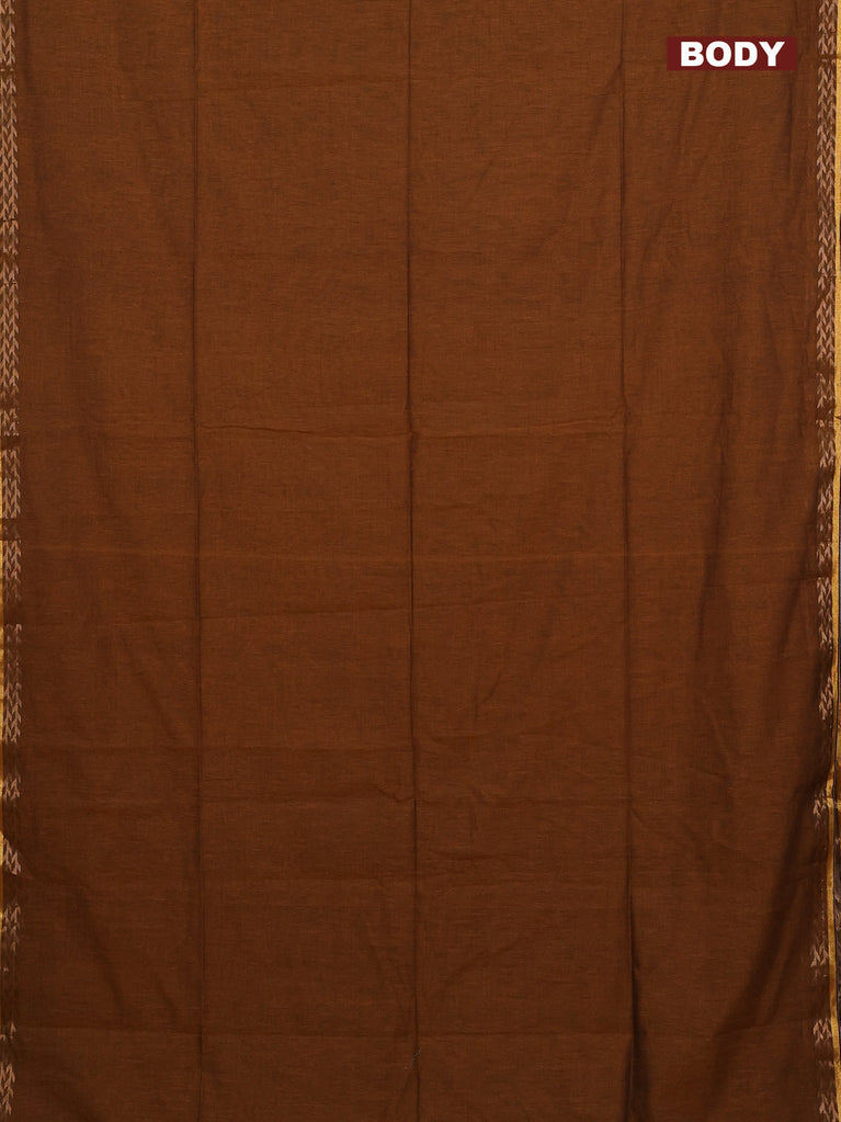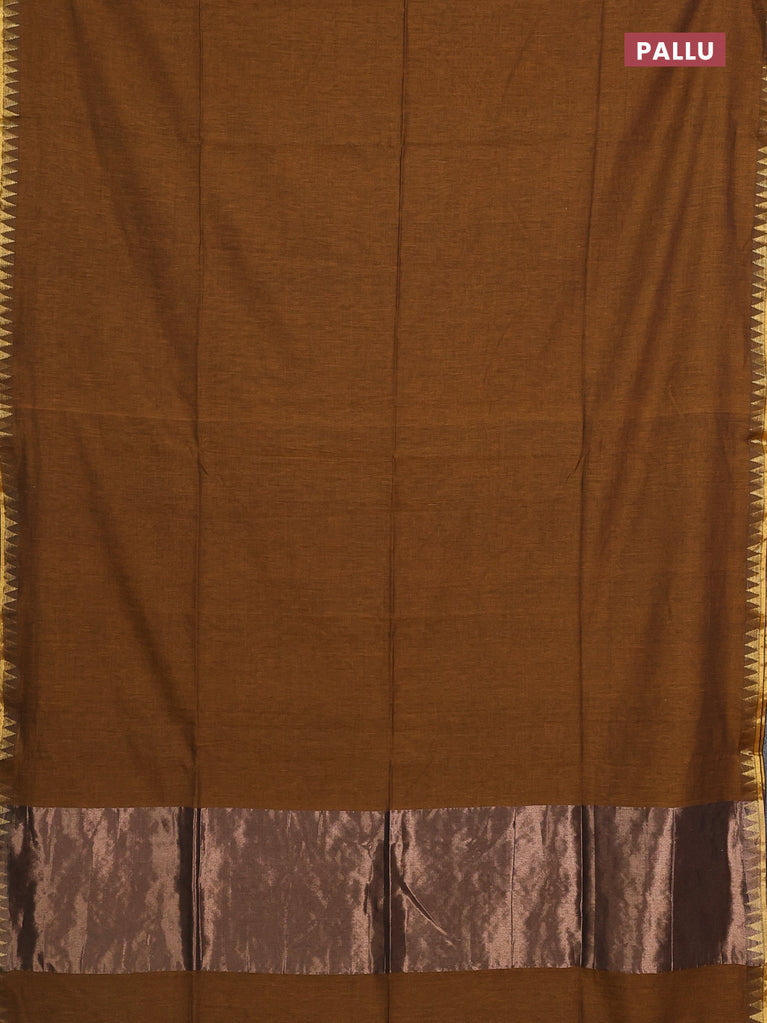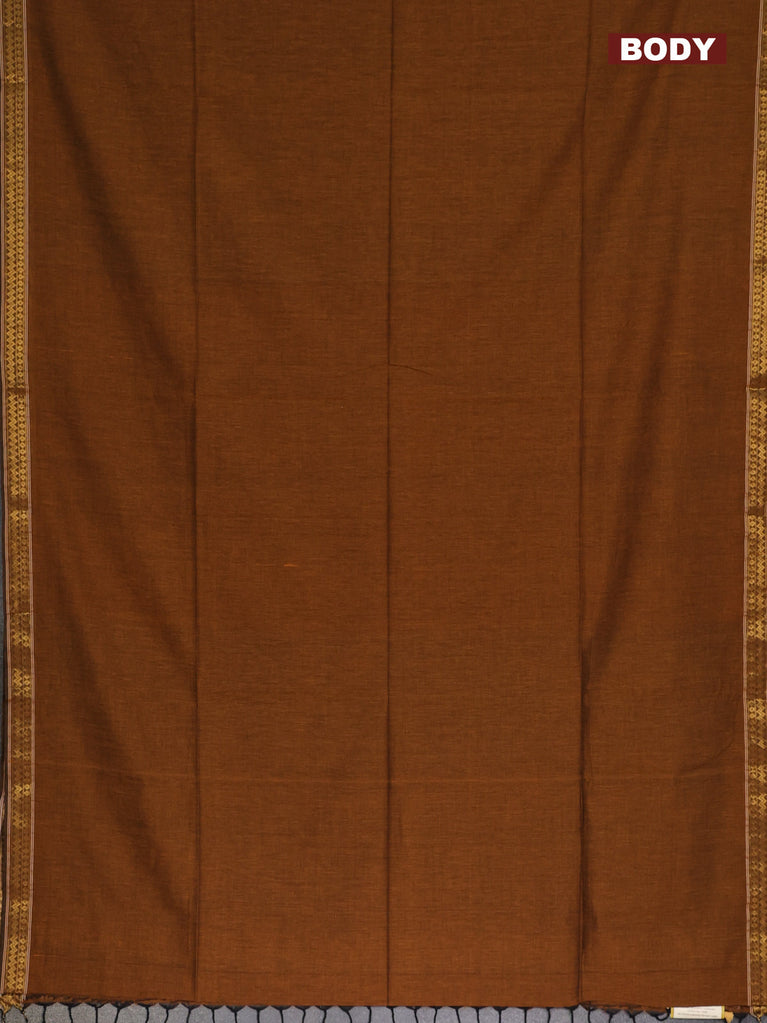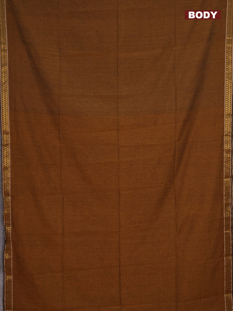 Bengal soft cotton saree dark msutard with plain body and temple design zari woven border