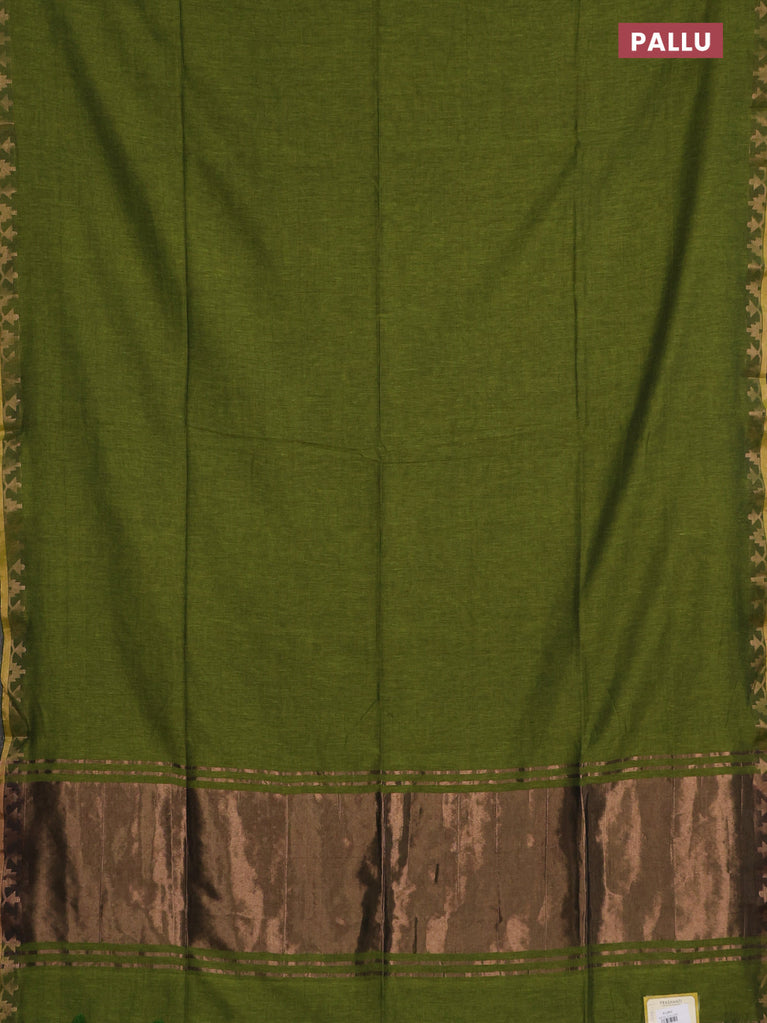 Bengal soft cotton saree dark mustard and green with plain body and zari woven border