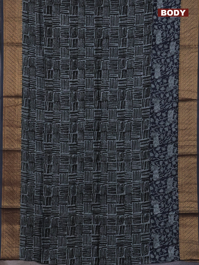 Chanderi silk cotton saree drak navy blue and grey with allover geometric prints and pichwai printed banarasi style border
