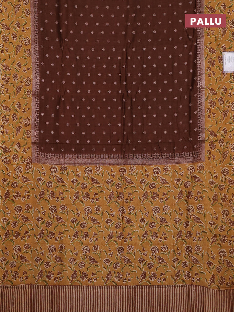Chanderi silk cotton saree dark mustard and brown with allover zig zag prints and banarasi style border