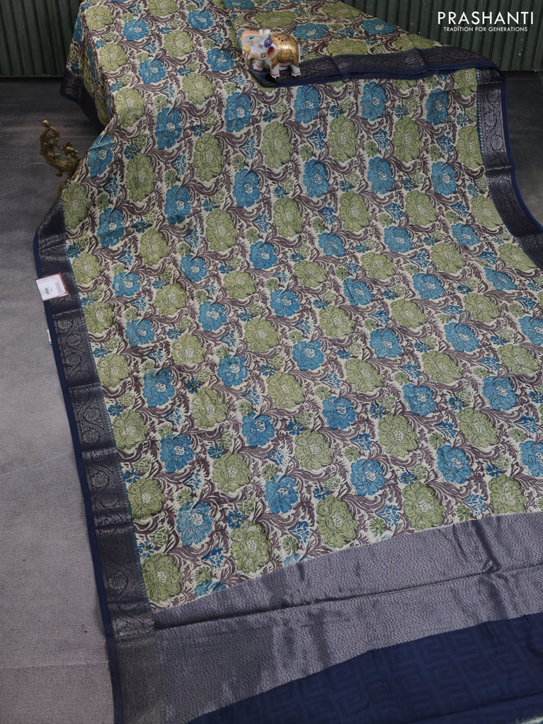 Chanderi silk cotton saree cream and dark blue with allover prints and banarasi style border