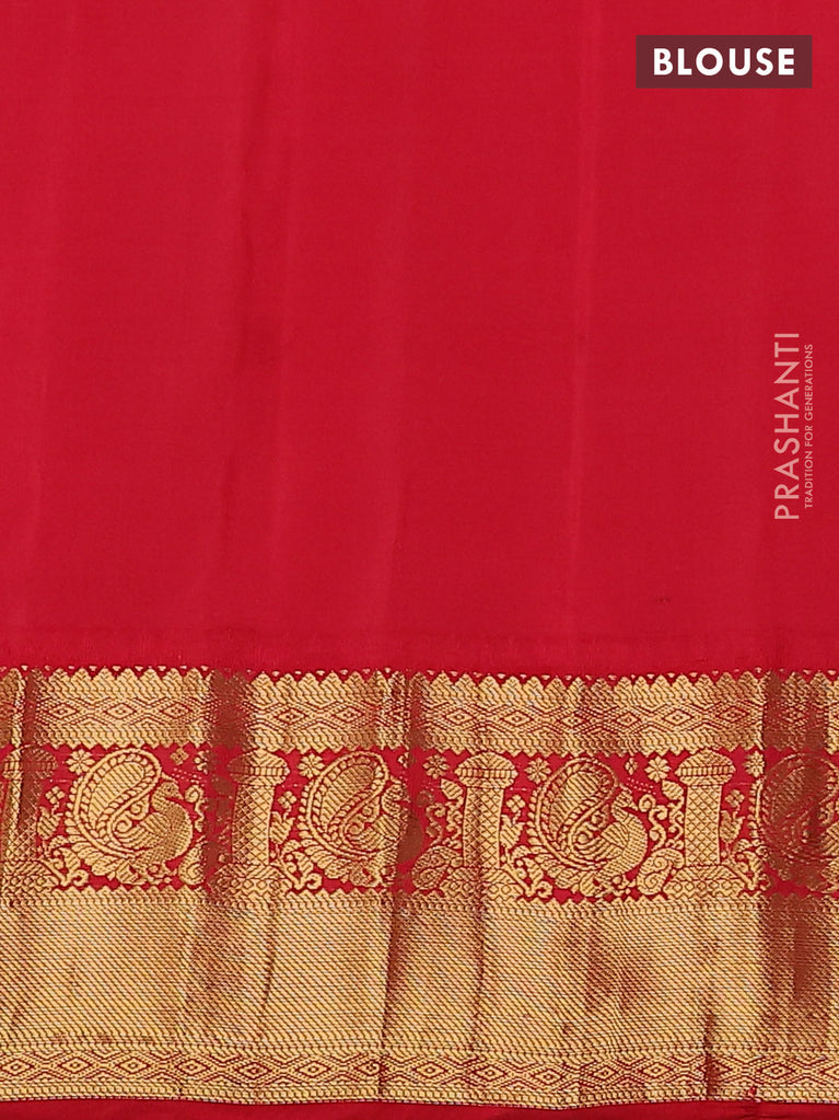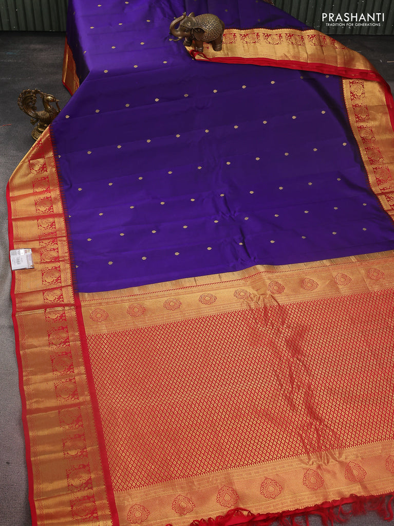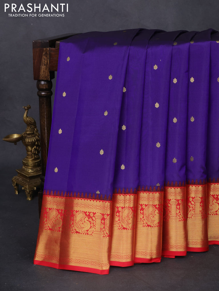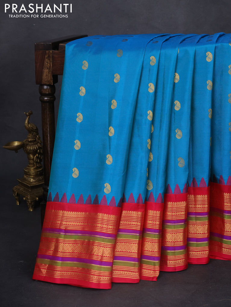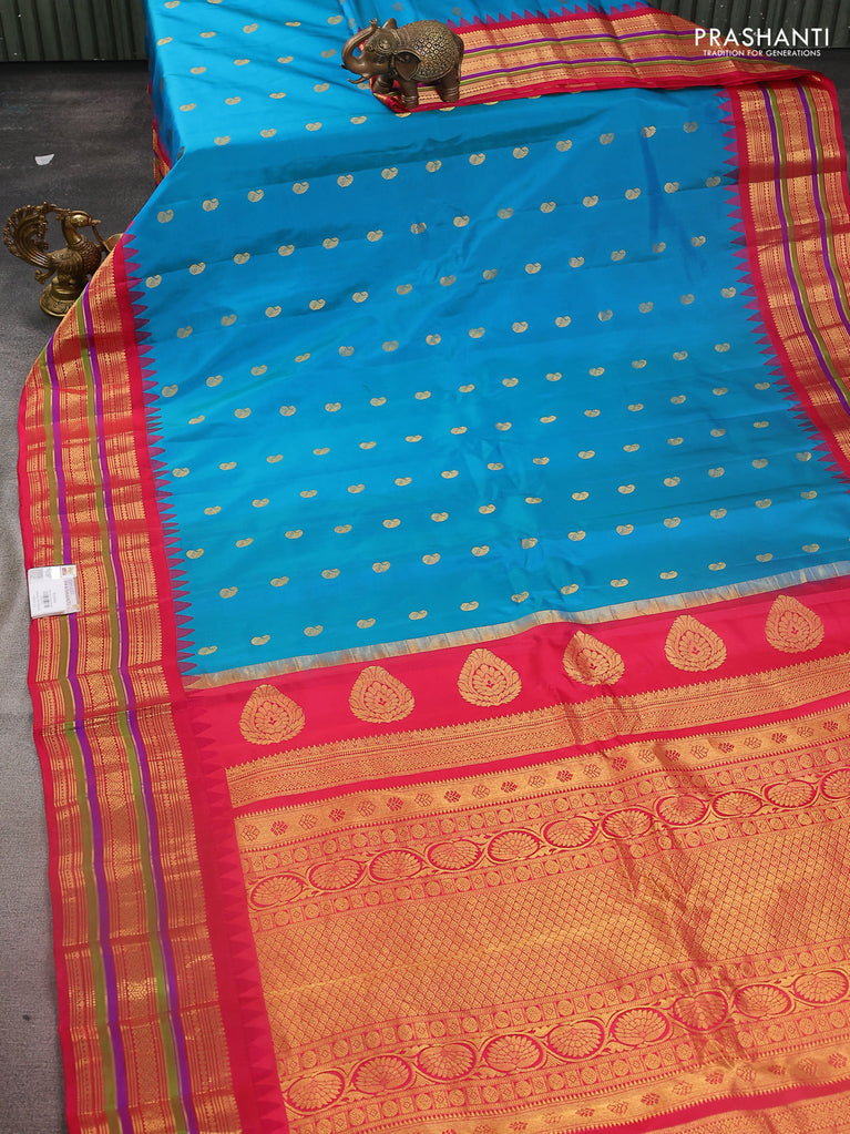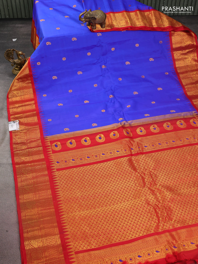 Pure gadwal silk saree blue and red with zari woven buttas and temple design zari woven border