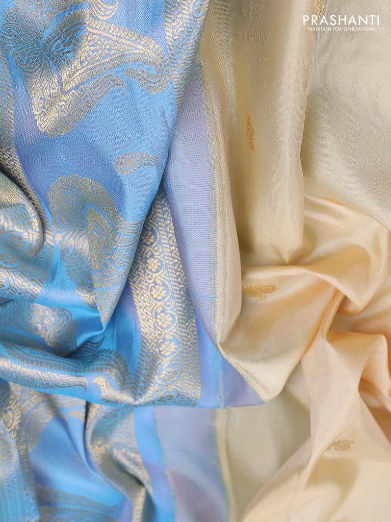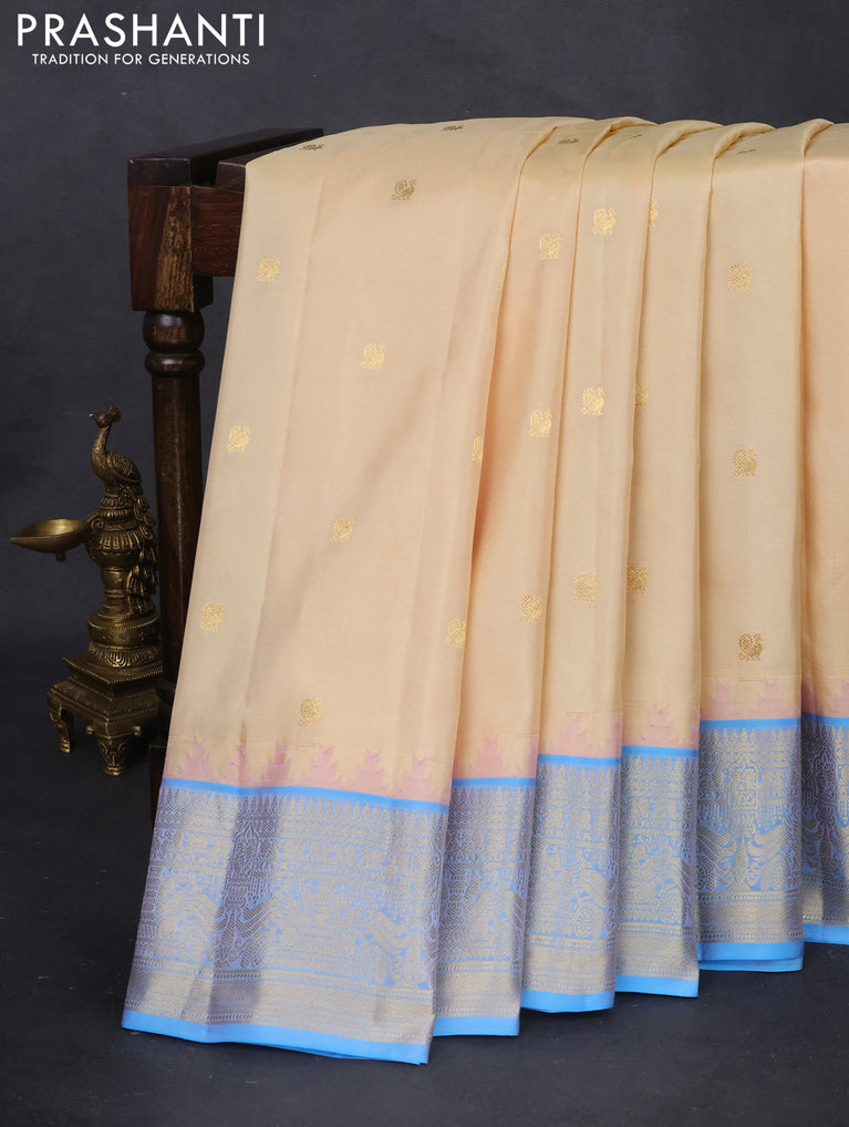 Pure gadwal silk saree cream and light blue with annam zari woven buttas and temple design zari woven border