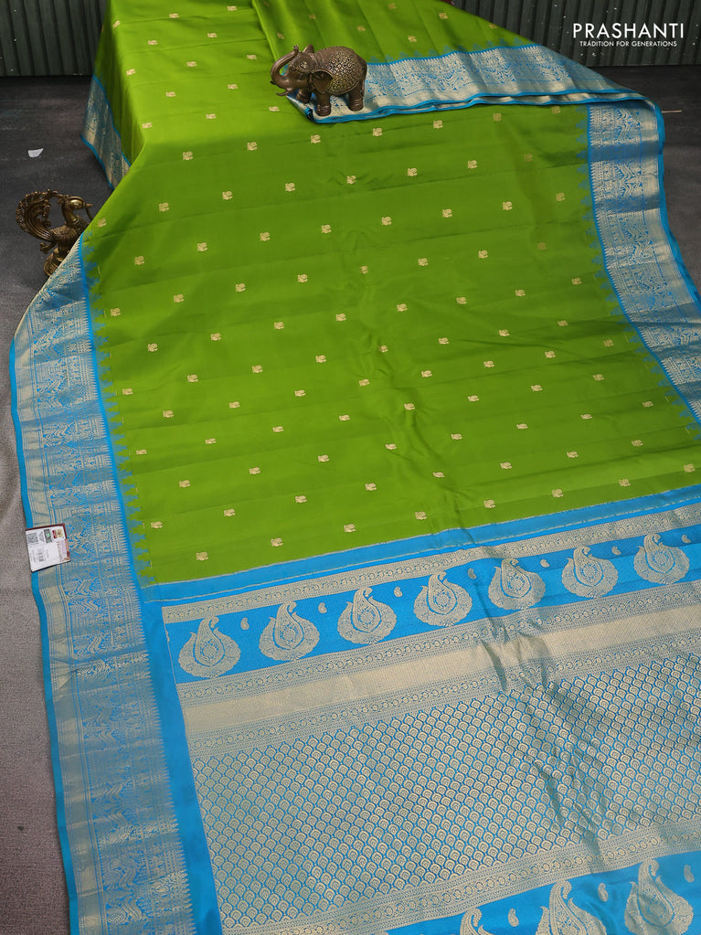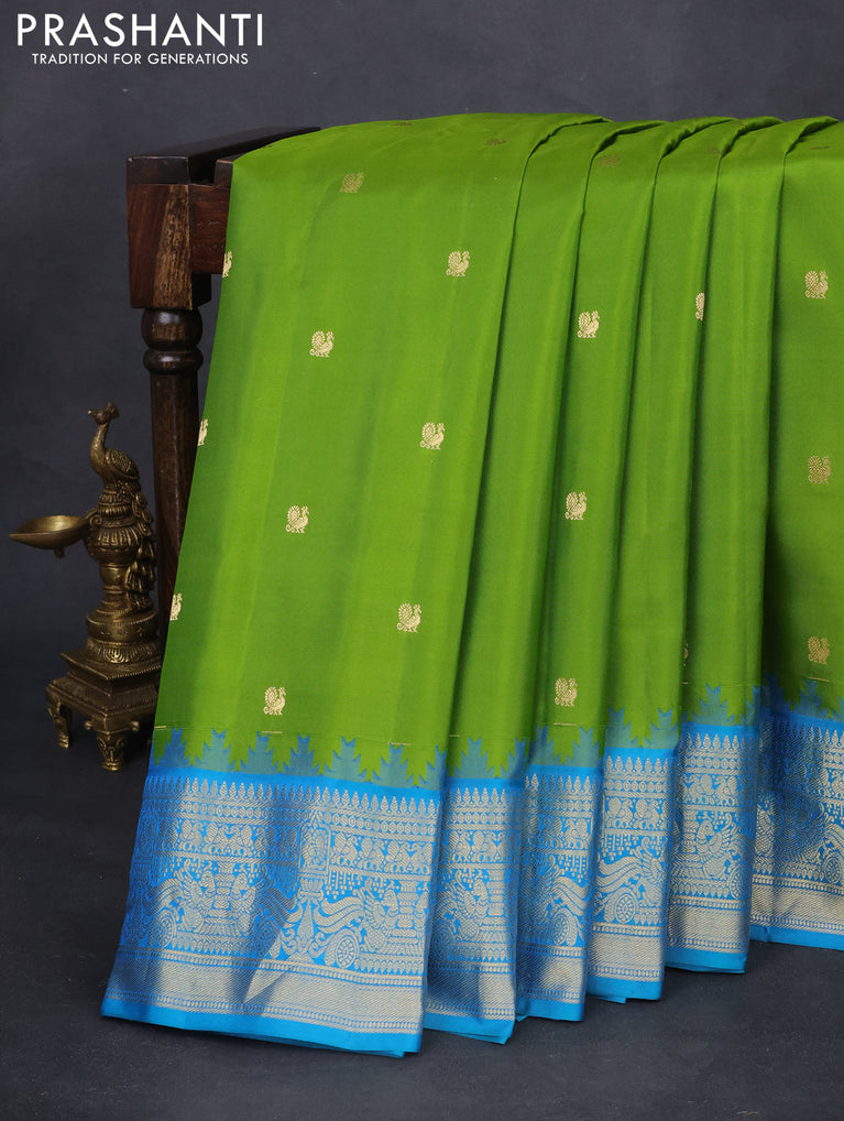 Pure gadwal silk saree light green and cs blue with annam zari woven buttas and temple design zari woven border