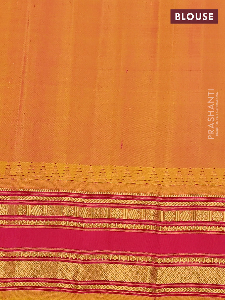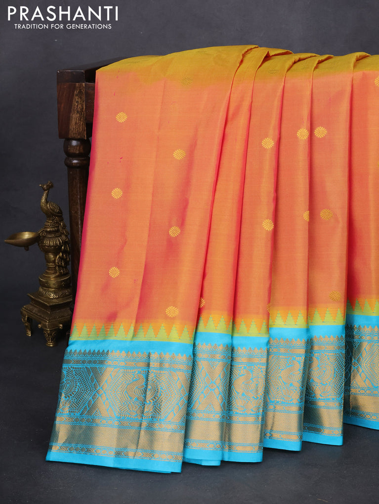 Pure gadwal silk saree dual shade of mustard and teal blue with zari woven buttas and temple design zari woven border