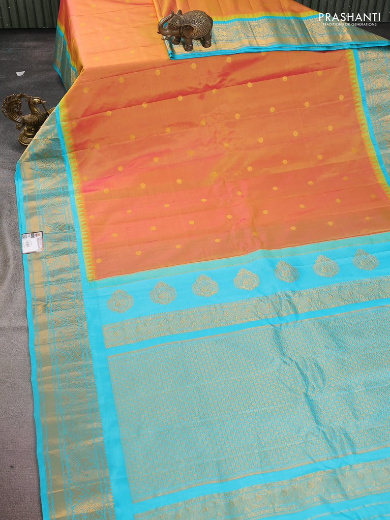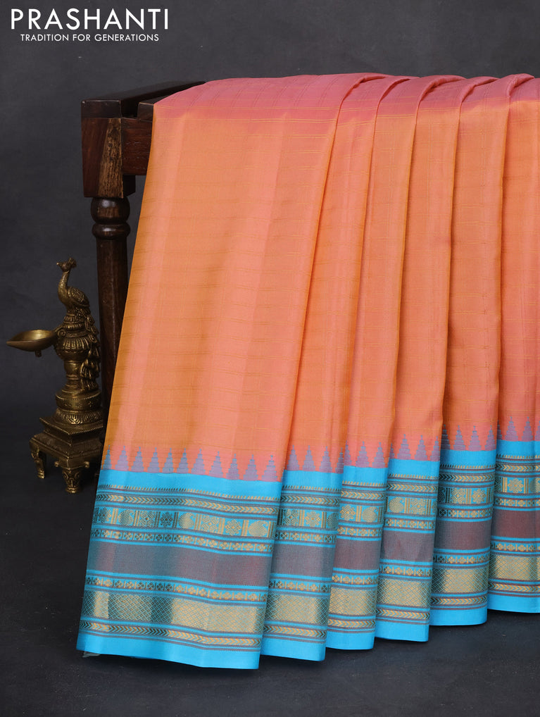 Pure gadwal silk saree dual shade of peach and teal blue with allover zari checked pattern and temple design zari woven border