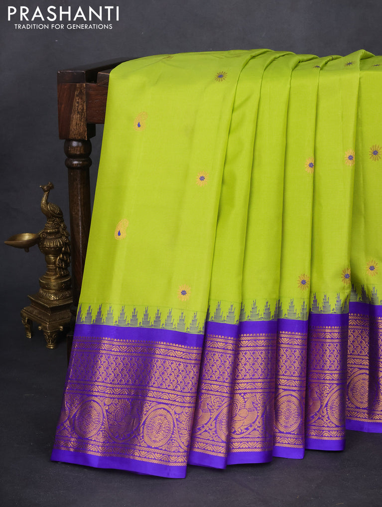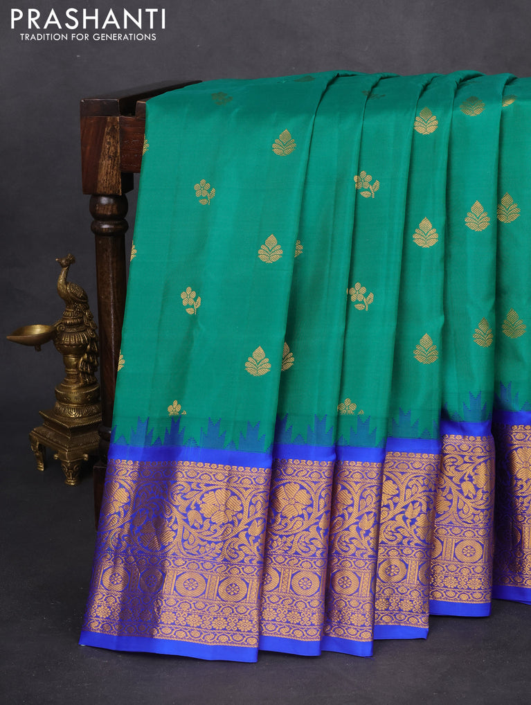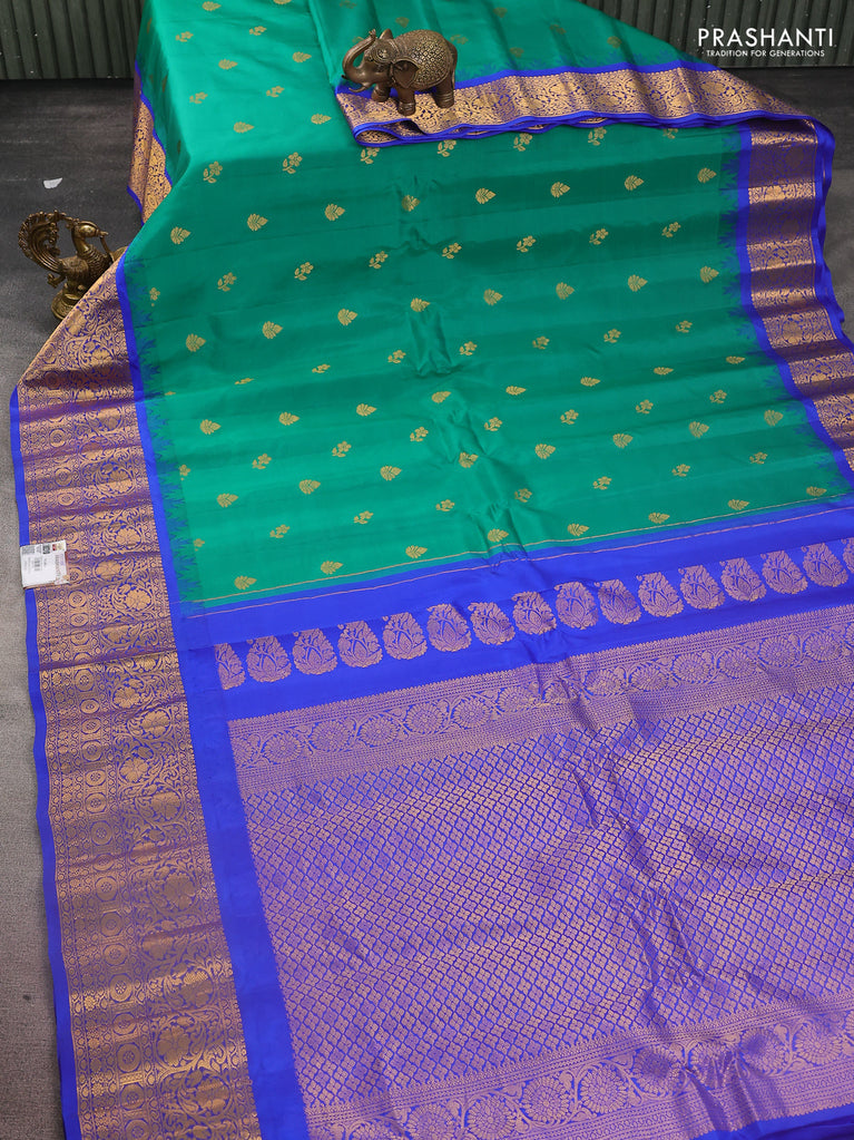 Pure gadwal silk saree green and blue with zari woven buttas and temple design zari woven border
