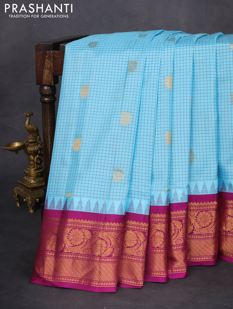 Pure gadwal silk saree light blue and purple with allover checked pattern & zari buttas and temple design zari woven border