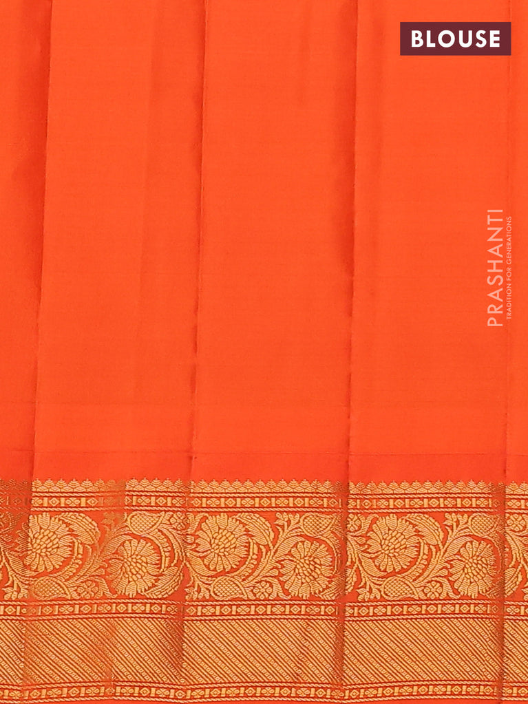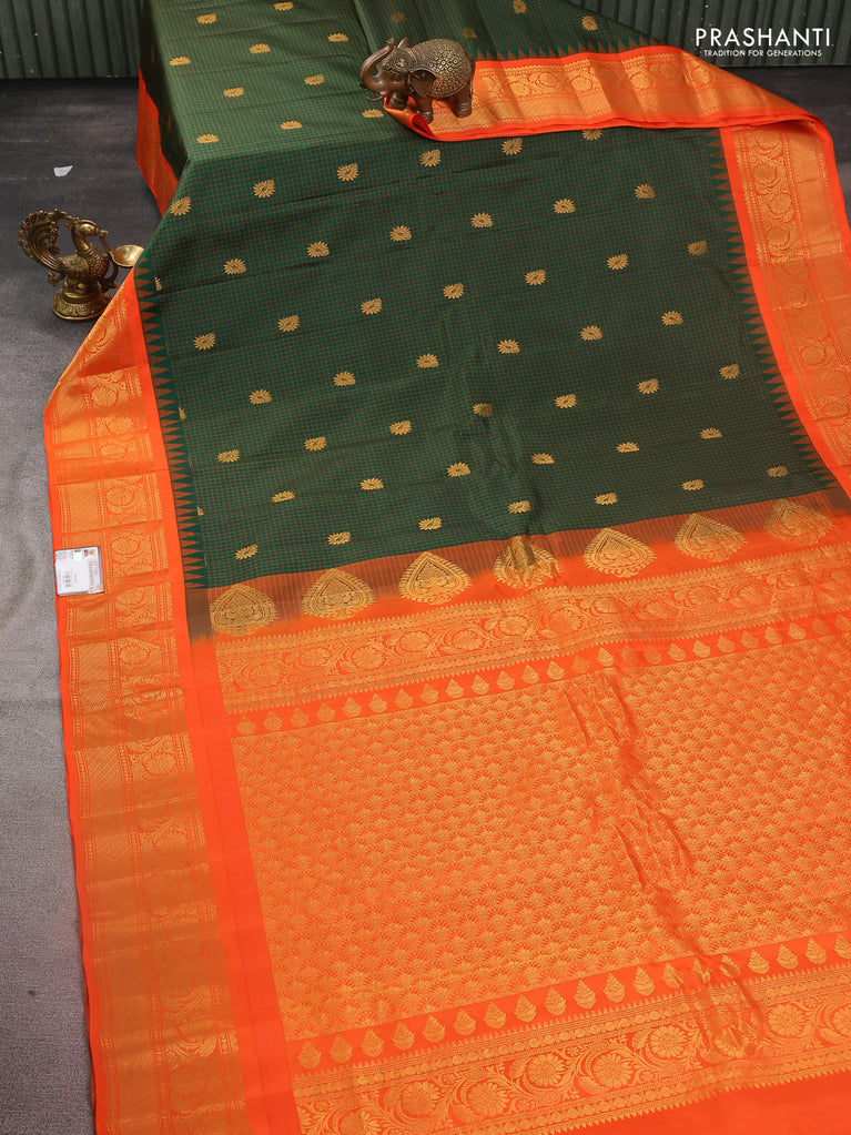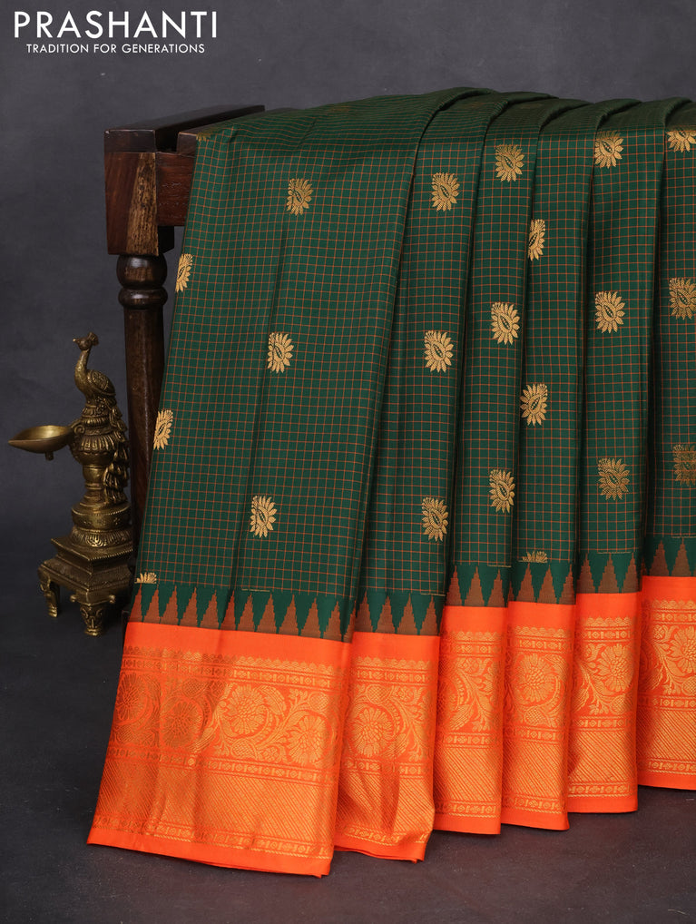 Pure gadwal silk saree bottle green and orange with allover checked pattern & zari buttas and temple design zari woven border
