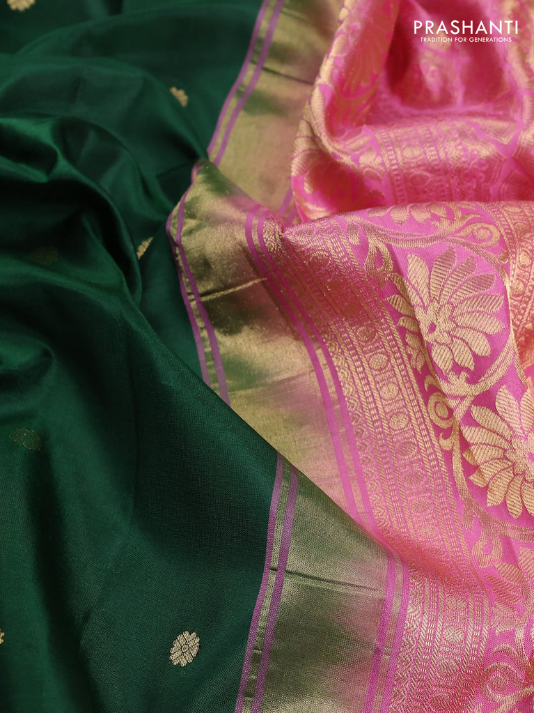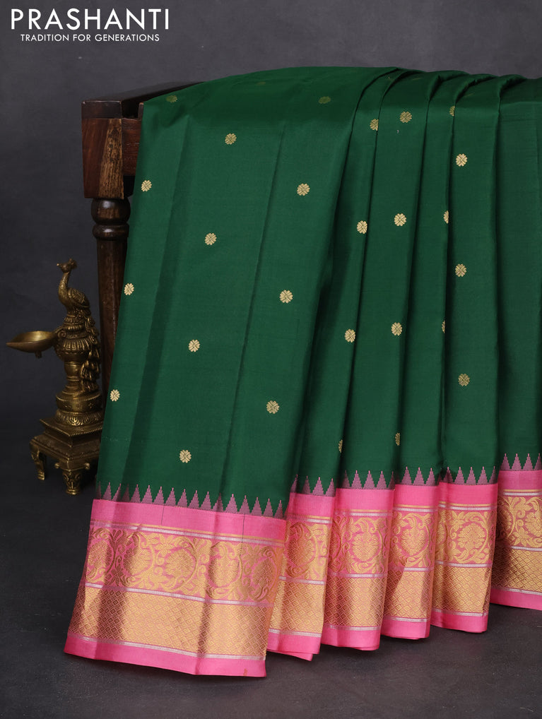 Pure gadwal silk saree green and pink with zari woven buttas and temple design zari woven border