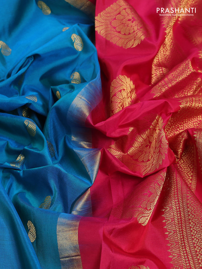 Pure gadwal silk saree cs blue and pink with zari woven paisley buttas and temple design zari woven border