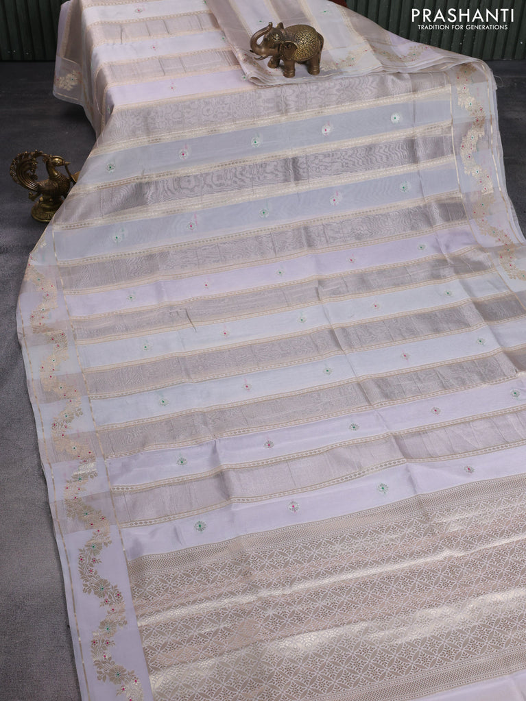 Banarasi tissue semi silk saree pastel grey and mild lavnder with allover zari weaves and zari woven floral border