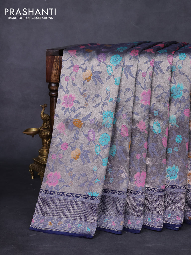 Banarasi tissue silk saree navy blue with allover thread woven floral weaves and silver zari woven border