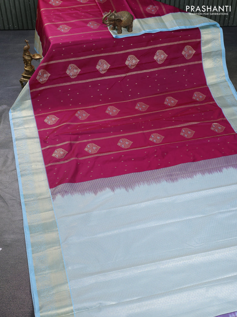 Bangalori silk saree dark magenta pink and pastel blue with allover zari weaves & buttas and zari woven border