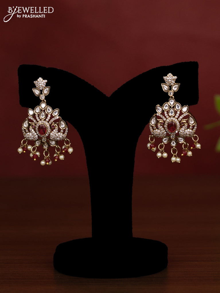 Beaded multilayer maroon necklace peacock design with ruby kundan & cz stones and pearl & beads hanging in victorian finish