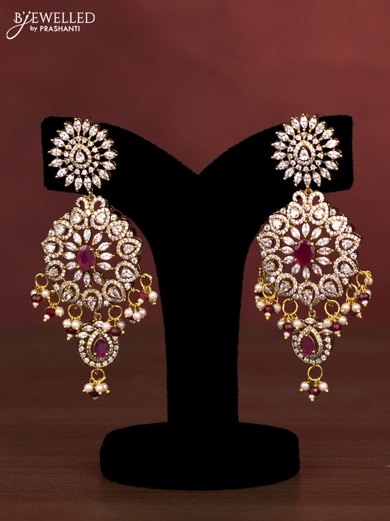 Beaded multilayer maroon necklace with ruby kundan & cz stones and pearl & beads hanging in victorian finish