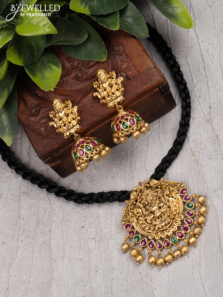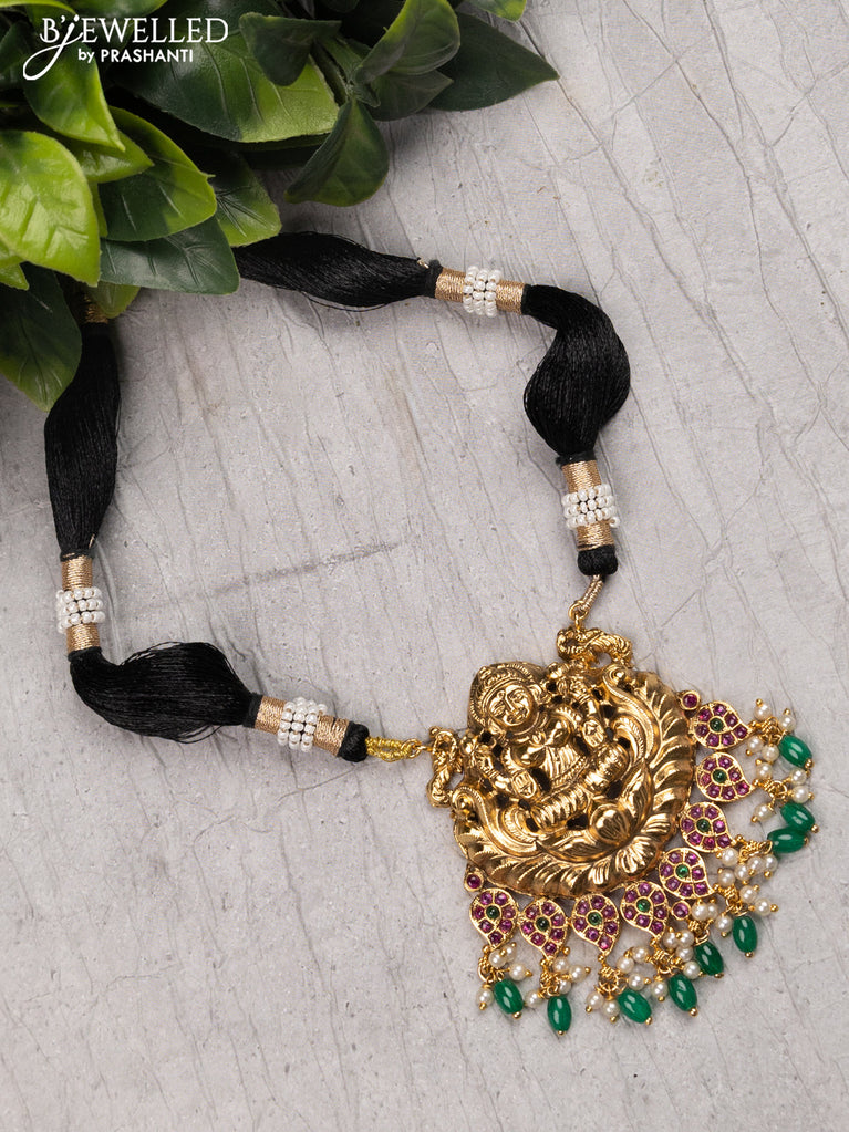 Black thread necklace with kemp stone and lakshmi pendant