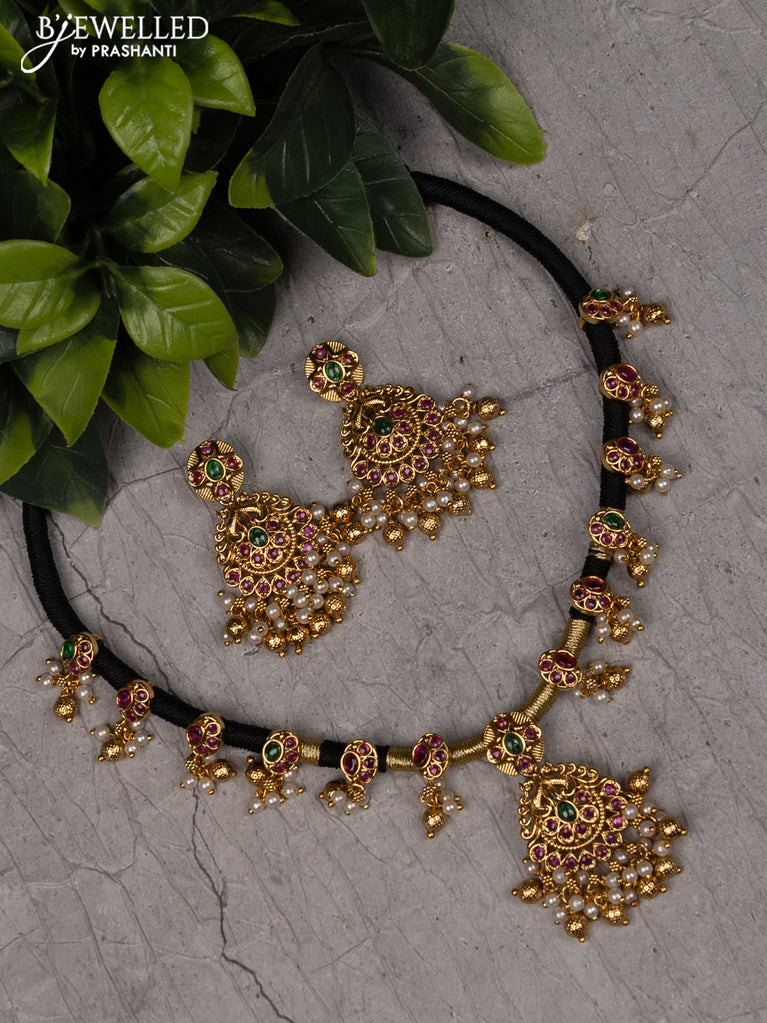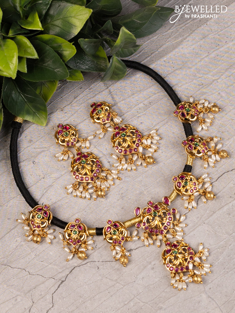 Black thread necklace with peacock design jhumka pendant kemp stone and pearl hangings without earrings