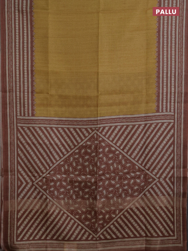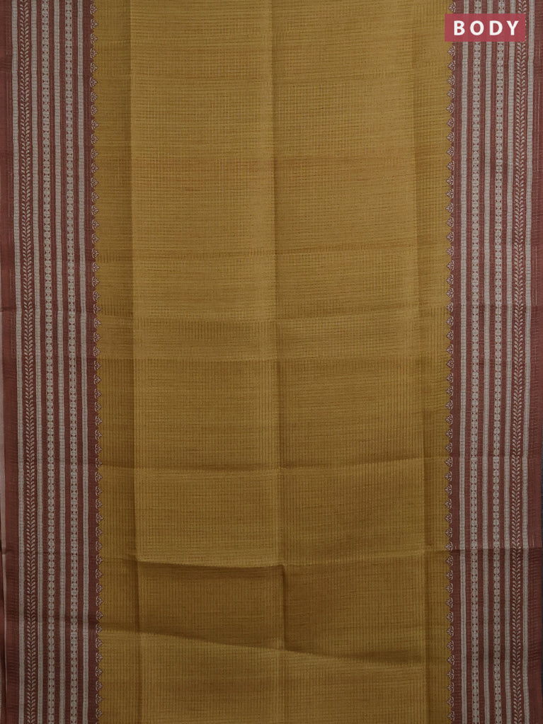 Chappa saree mustard shade and brown with allover small zari checked pattern and printed border