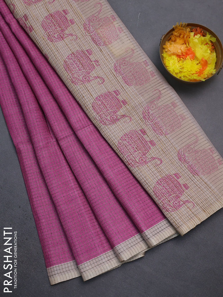 Chappa saree magenta pink and beige with allover small zari checked pattern and elephant butta prints